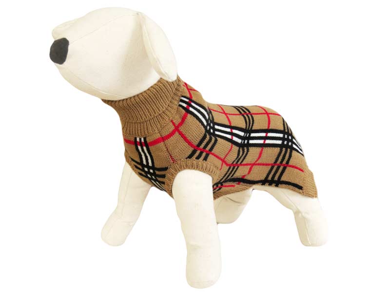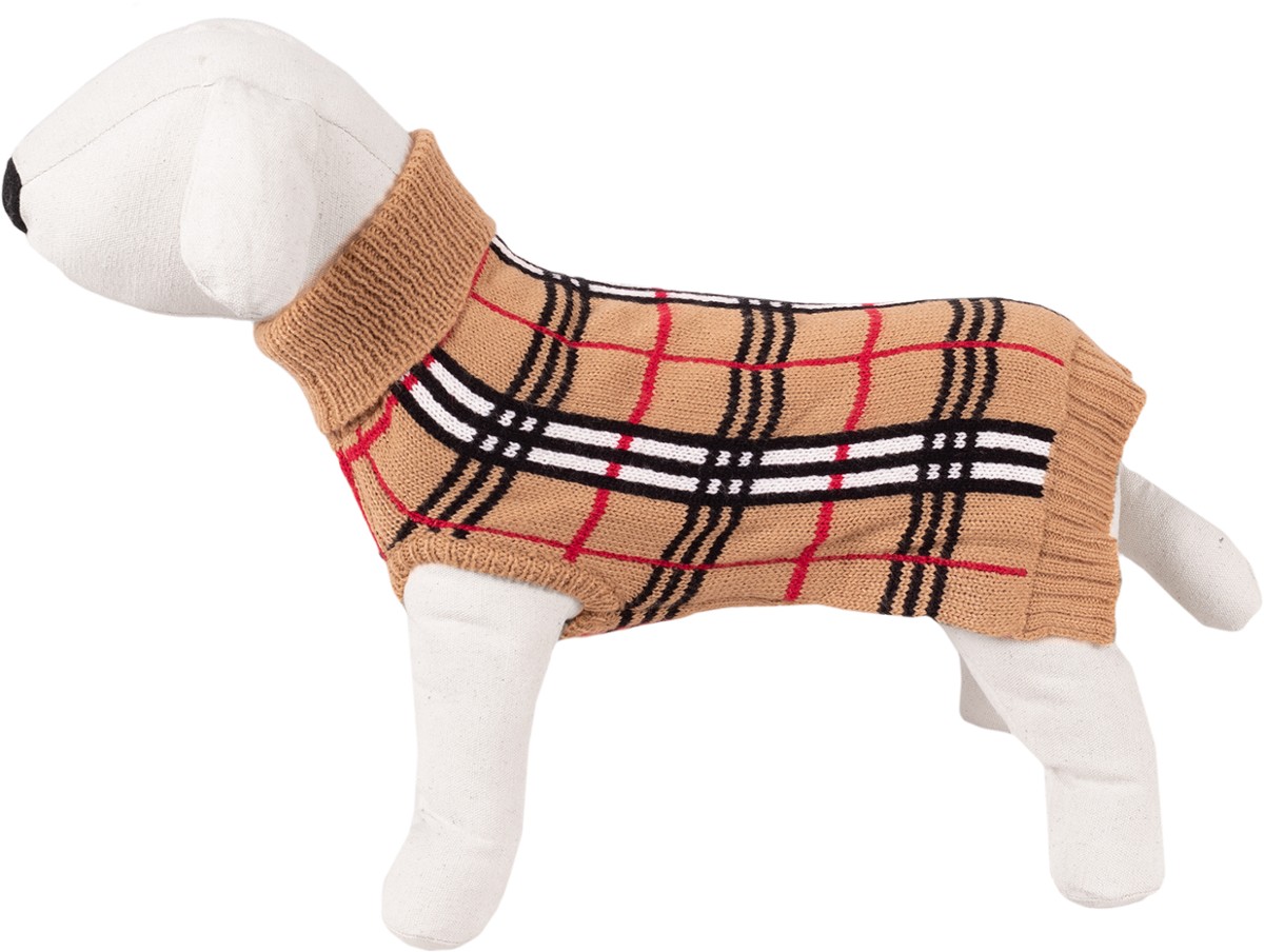 Lekki i ciepły beżowy sweterek w kratę dla większego psa. Wygodny oraz miękki w dotyku, zakładany przez głowę, z golfem chroniącym szyję psa przed wiatrem. Krój idealnie dopasowany do sylwetki zwierzęcia gwarantuje doskonałą ochronę przed chłodem w okresie jesienno-zimowym. Długość grzbietu 40 cm.