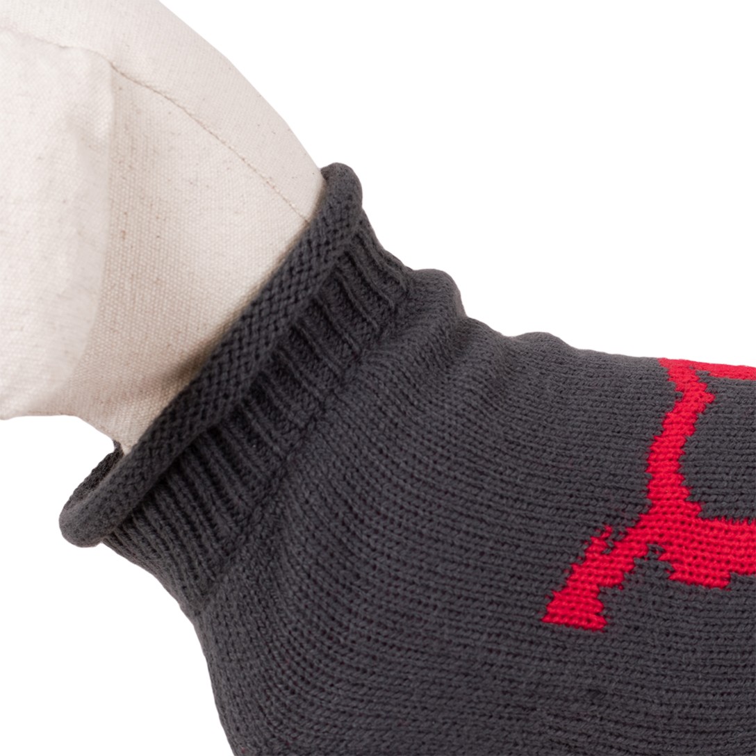 Lekki i ciepły sweterek w kolorze grafitowym z atrakcyjnym wzorem serc. Wygodny oraz miękki w dotyku, zakładany przez głowę, ze ściągaczem przy szyi. Krój idealnie dopasowany do sylwetki zwierzęcia gwarantuje doskonałą ochronę przed chłodem w okresie jesienno-zimowym. Długość grzbietu 35 cm.