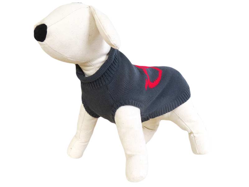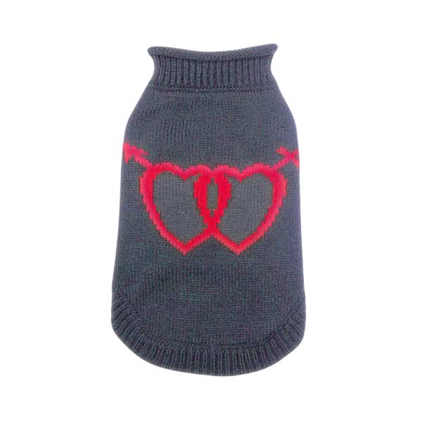 Lekki i ciepły sweterek w kolorze grafitowym z atrakcyjnym wzorem serc. Wygodny oraz miękki w dotyku, zakładany przez głowę, ze ściągaczem przy szyi. Krój idealnie dopasowany do sylwetki zwierzęcia gwarantuje doskonałą ochronę przed chłodem w okresie jesienno-zimowym. Długość grzbietu 25cm.