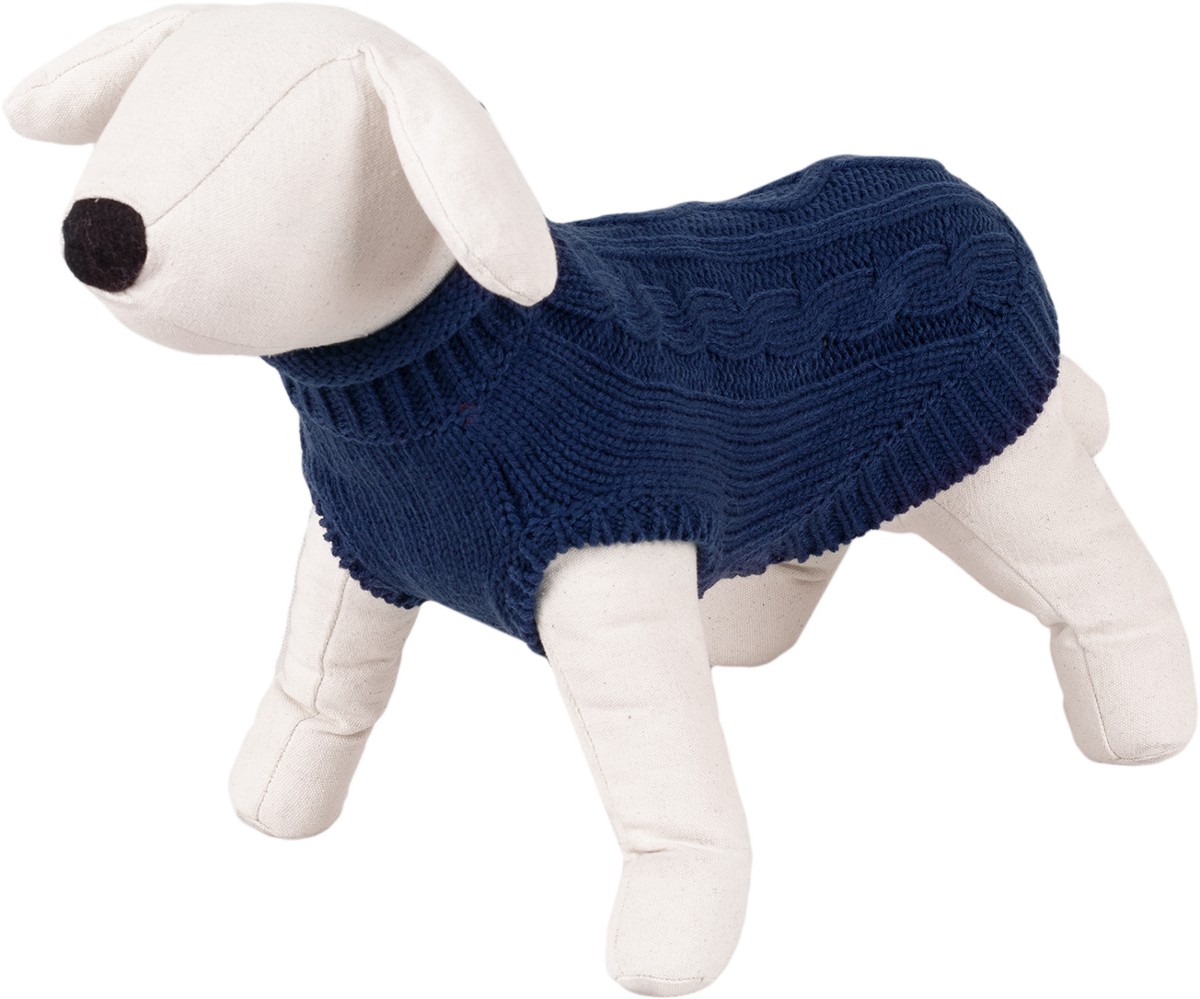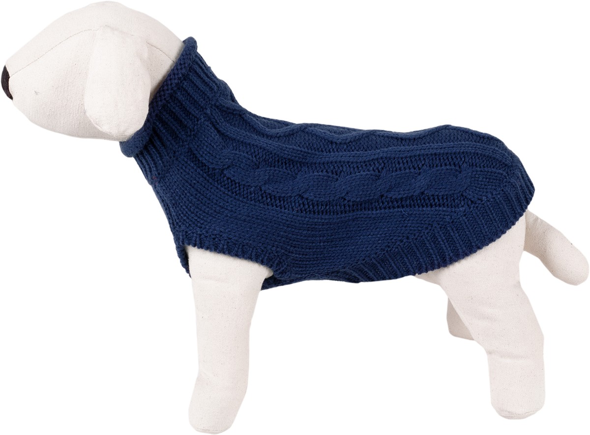 Lekki i ciepły granatowy sweterek z warkoczowym splotem. Wygodny oraz miękki w dotyku, zakładany przez głowę, ze ściągaczem przy szyi. Krój idealnie dopasowany do sylwetki zwierzęcia gwarantuje doskonałą ochronę przed chłodem w okresie jesienno-zimowym. Długość grzbietu 40 cm.