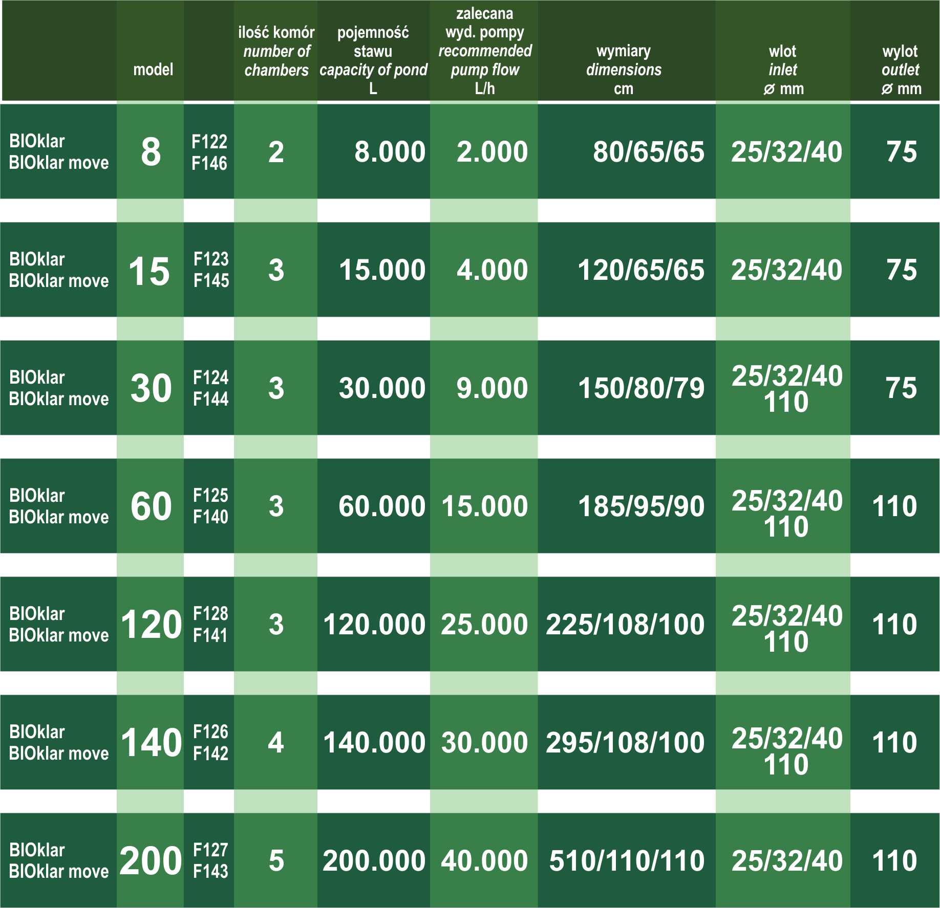 Tabela filtrów BIOklar: