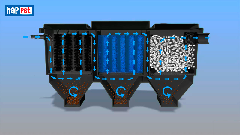 Zasada działania filtra polega na przepływie wody ze stawu przez kolejne komory, trafiając zawsze najpierw do odstojnika, w którym wytrącają się większe zanieczyszcznia.  Z odstojników woda płynie ku górze przechodząc przez kolejne warstwy filtracyjne.