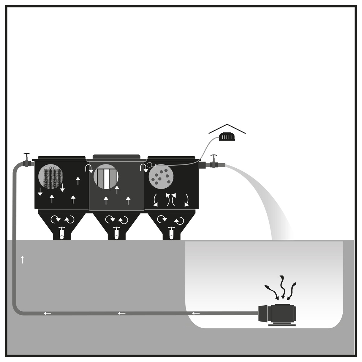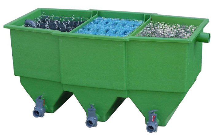 Filtry BIOklar dostępne są także w wersji grawitacyjnej, w której woda ze stawu napływa do filtra pod wpływem siły grawitacji i po przefiltrowaniu przez wszystkie materiały jest wypompowywana z ostatniej komory.