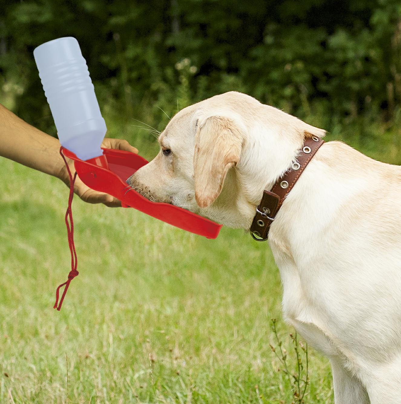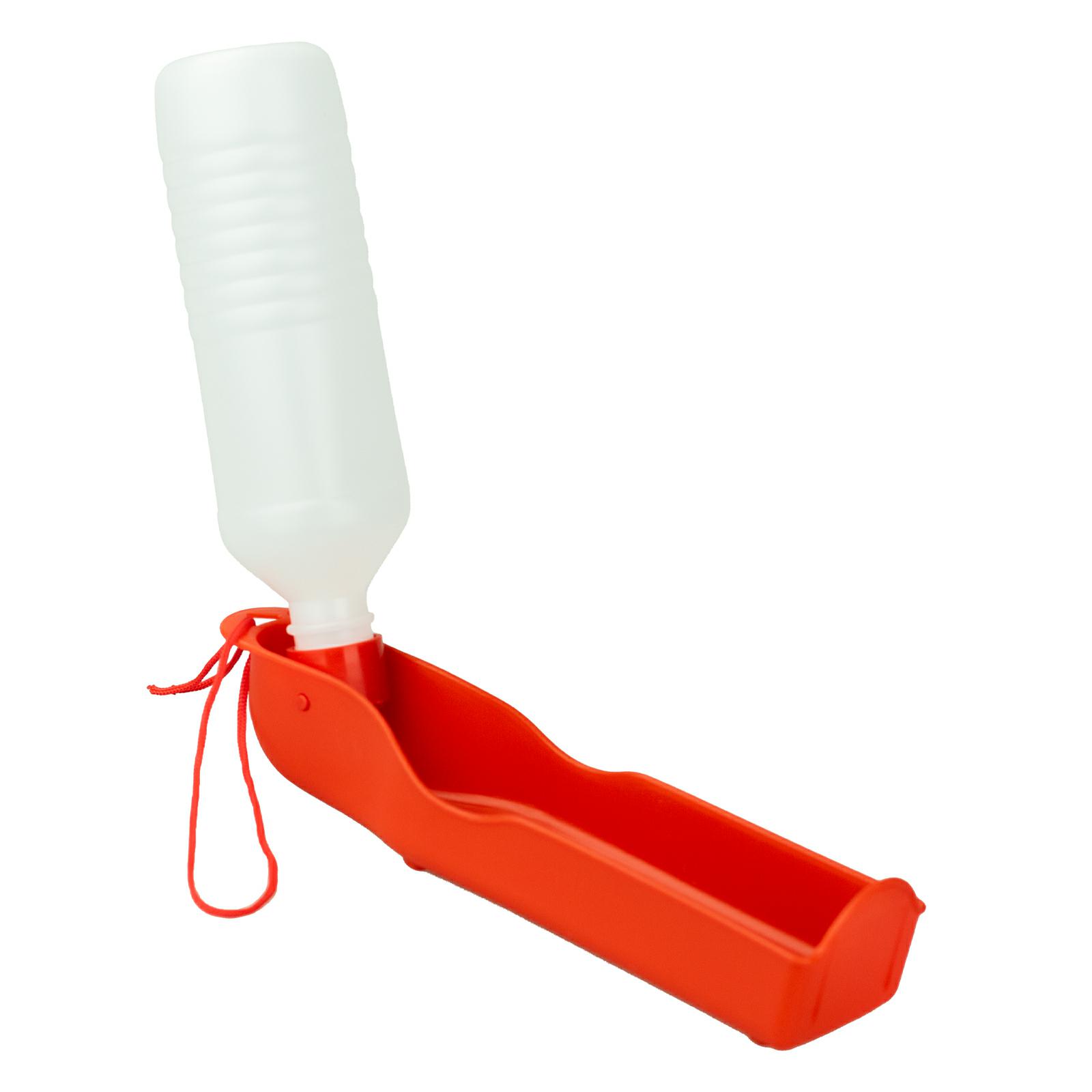 Butelka podróżna to wygodne połączenie butelki i miski. W całości wykonana z bezpiecznego plastiku, dzięki czemu jest lekka i wygodna w podróży lub podczas spacerów. Gumowa zatyczka zabezpiecza przed niekontrolowanym wylaniem się wody.