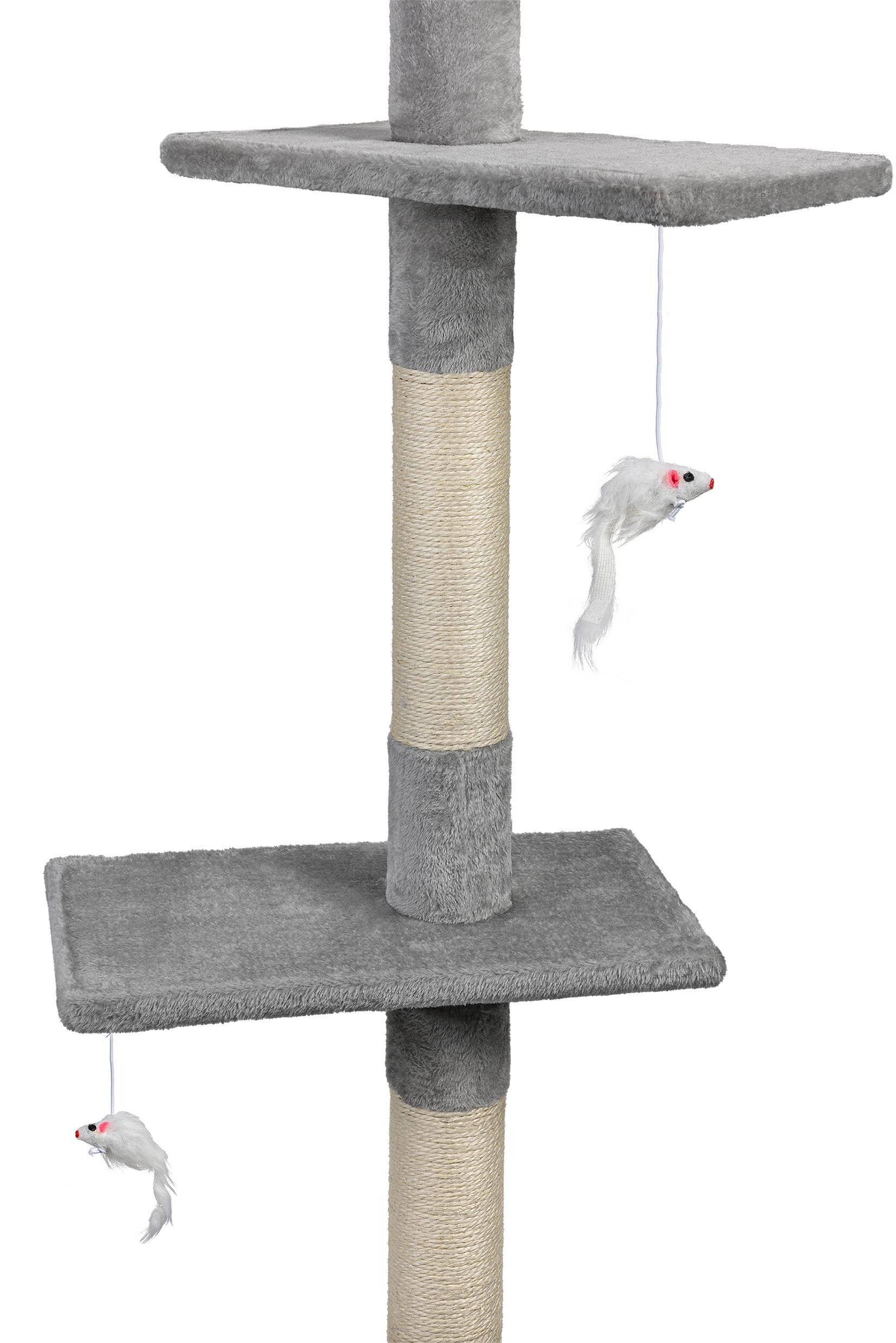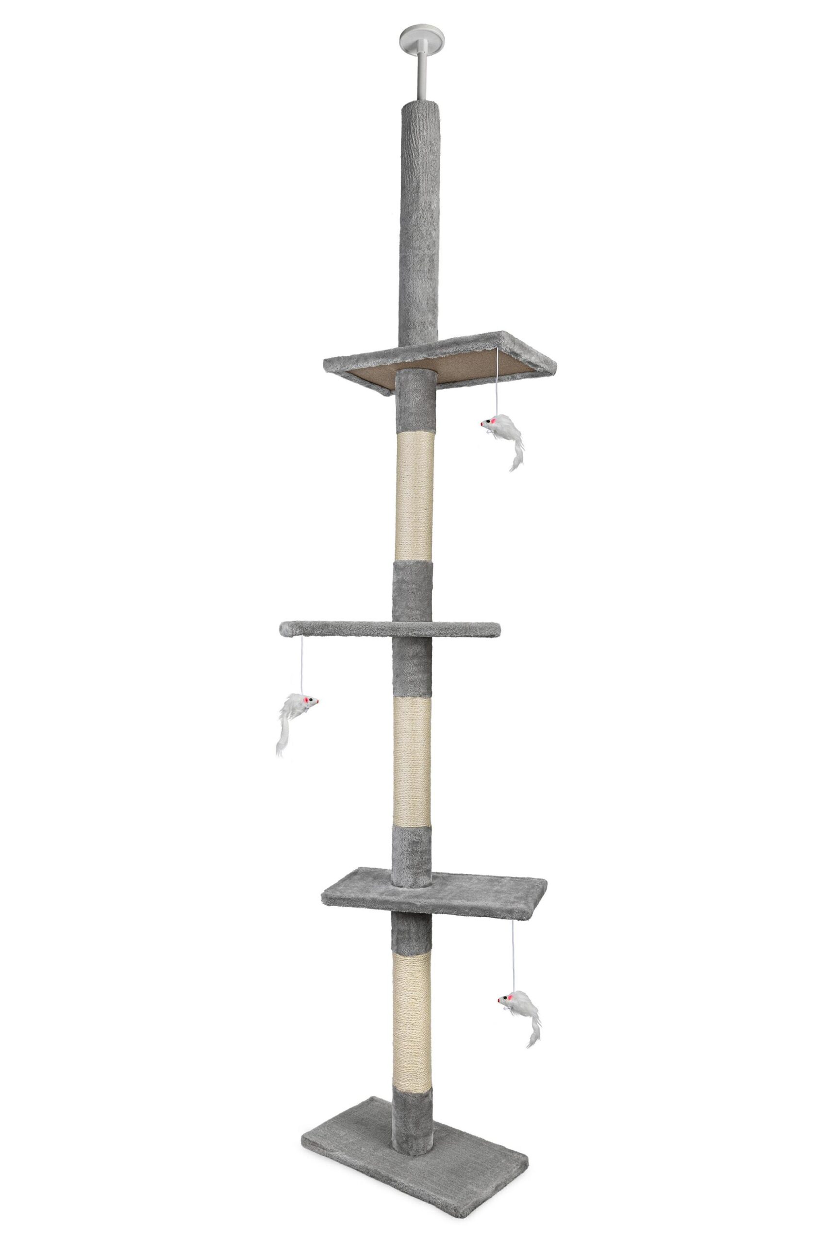 Prezentowany model drapaka dla kotów (drzewa do wspinania) składa się z ramy owiniętej sizalowym sznurem oraz platform pokrytych pluszem. Elementem wyposażenia są również wiszące piłeczki, którymi może bawić się Twój pupil.