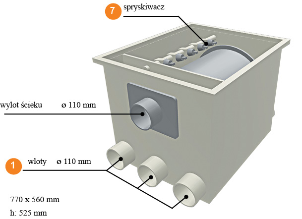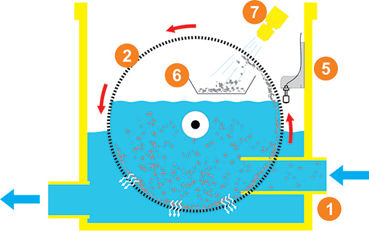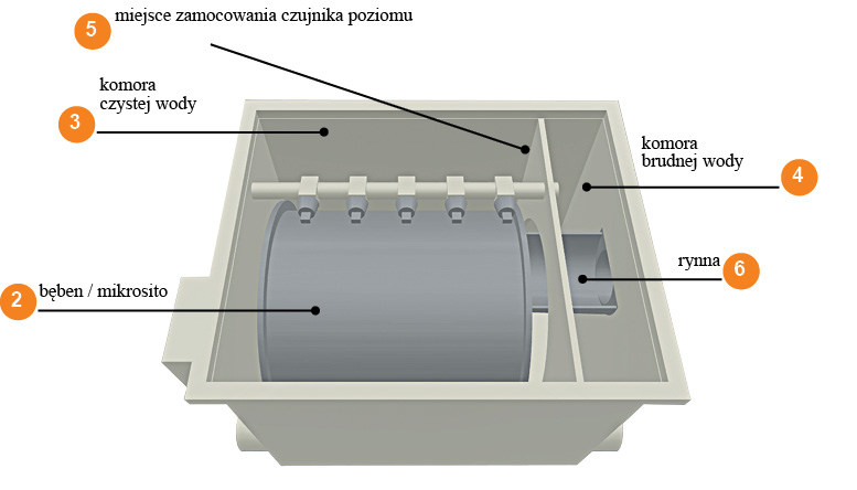 Woda ze stawu, grawitacyjnie lub z pompy, przez wlot dostaje się do środka bębna. Stąd przechodzi przez drobne otworki mikrosita do komory filtra, zostawiając na wewnętrznej stronie bębna wszystkie zanieczyszczenia. Kiedy mikrosito zostanie mocno zanieczyszczone, pojawia się różnica poziomu wody między komorą filtra, a środkiem bębna. Czujnik poziomu wody zostaje aktywowany, a sterownik włącza obrót bębna i spryskiwacze. Woda pod ciśnieniem spłukuje zanieczyszczenia z wewnętrznej strony mikriosita na bębnie do specjalnej rynny. Brudna woda z zanieczyszczeniami zostaje odprowadzona do kanalizacji. Po jednym obrocie bębna mikrosito zostaje oczyszczone. Kiedy na wewnętrznej stronie mikrosita znowu zbiorą się zanieczyszczenia, cykl się powtarza.