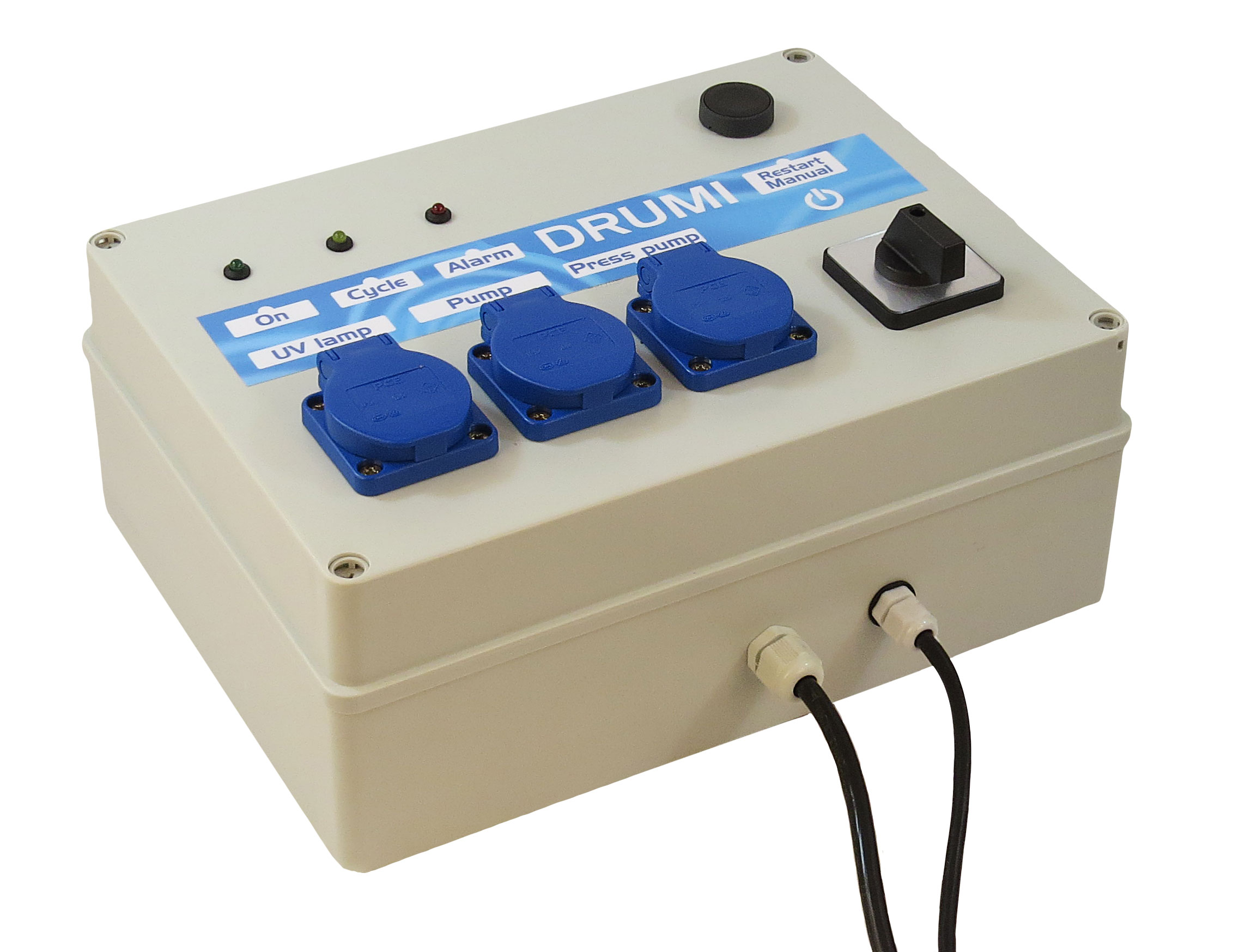 Sterowanie cyklami spryskiwania odbywa się za pomocą sterownika elektronicznego. Otrzymuje on informację z czujnika poziomu wody zamontowanego wewnątrz filtra. W razie potrzeby włącza dodatkowe spryskiwanie, a wypadku awarii wyłącza urządzenie całkowicie. Sterownik posiada możliwość łatwego ręcznego ustawiania poszczególnych czasów związanych z cyklem pracy.