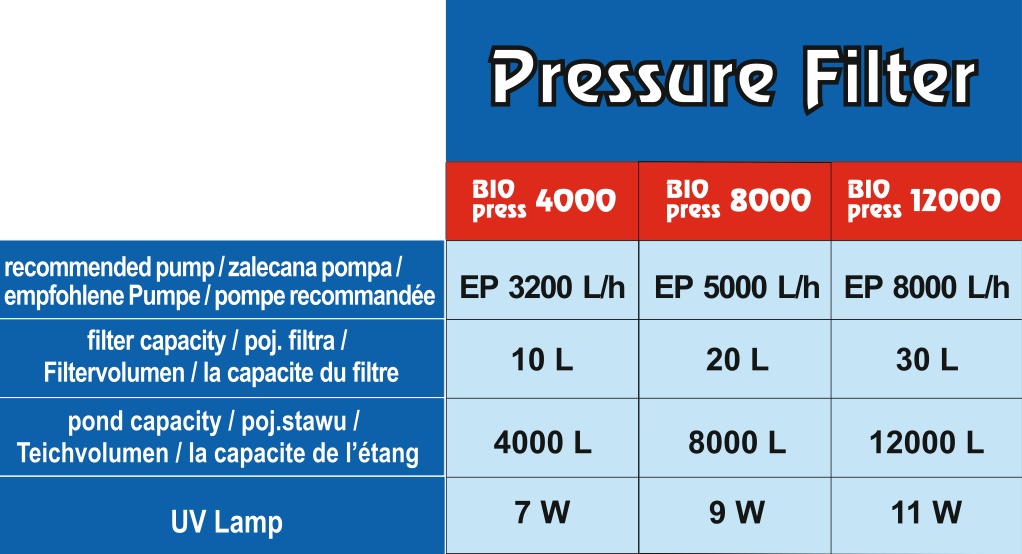 Filtr ciśnieniowy dla niewielkich (<4000 l) oczek wodnych. Zapewnia zarówno filtrację mechaniczną, jak i biologiczną. Gąbkowy wkład skutecznie zatrzymuje fizyczne zanieczyszczenia wody (odchody ryb, szczątki roślin, szlam), a biokulki stanowią dogodne środowisko rozwoju dla biorących udział w cyklu azotowym bakterii nitryfikacyjnych. Filtr nadaje się do pracy zakopany w podłożu aż po głowicę. Sprawdzi się więc w ozdobnych oczkach wodnych, nie psując naturalnego wyglądu stawu.