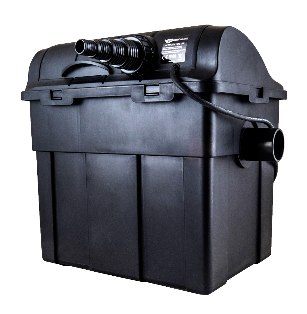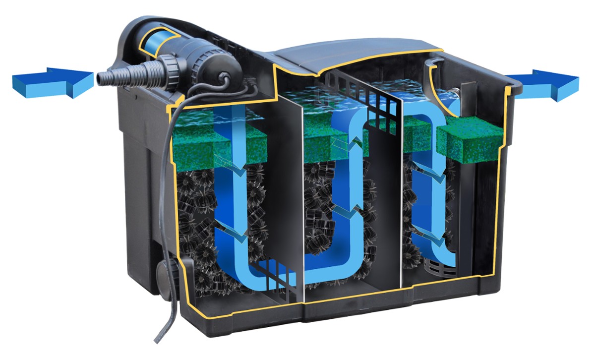 Filtr do stawu z trójstopniową filtracją – mechaniczną, biologiczną i UC-C. Lampa UV pozwala pozbyć się z wody drobnoustrojów chorobotwórczych oraz glonów. Pomaga utrzymać krystalicznie czysta wodę, zapobiega zakwitowi wody w stawie. Efekt tzw. „zielonej wody” nie powinien wystąpić.