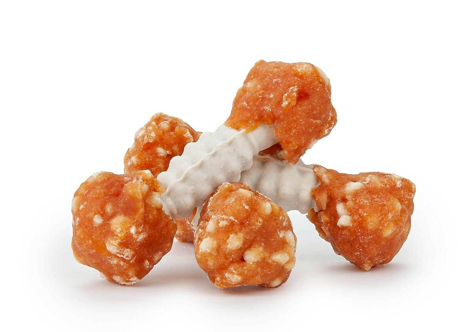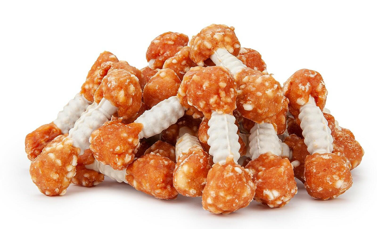 Niewielki dental ryżowy jest owinięty mięsem z piersi kurczaka. Wygląda bardzo apetycznie i zachęcająco dla każdego psa.