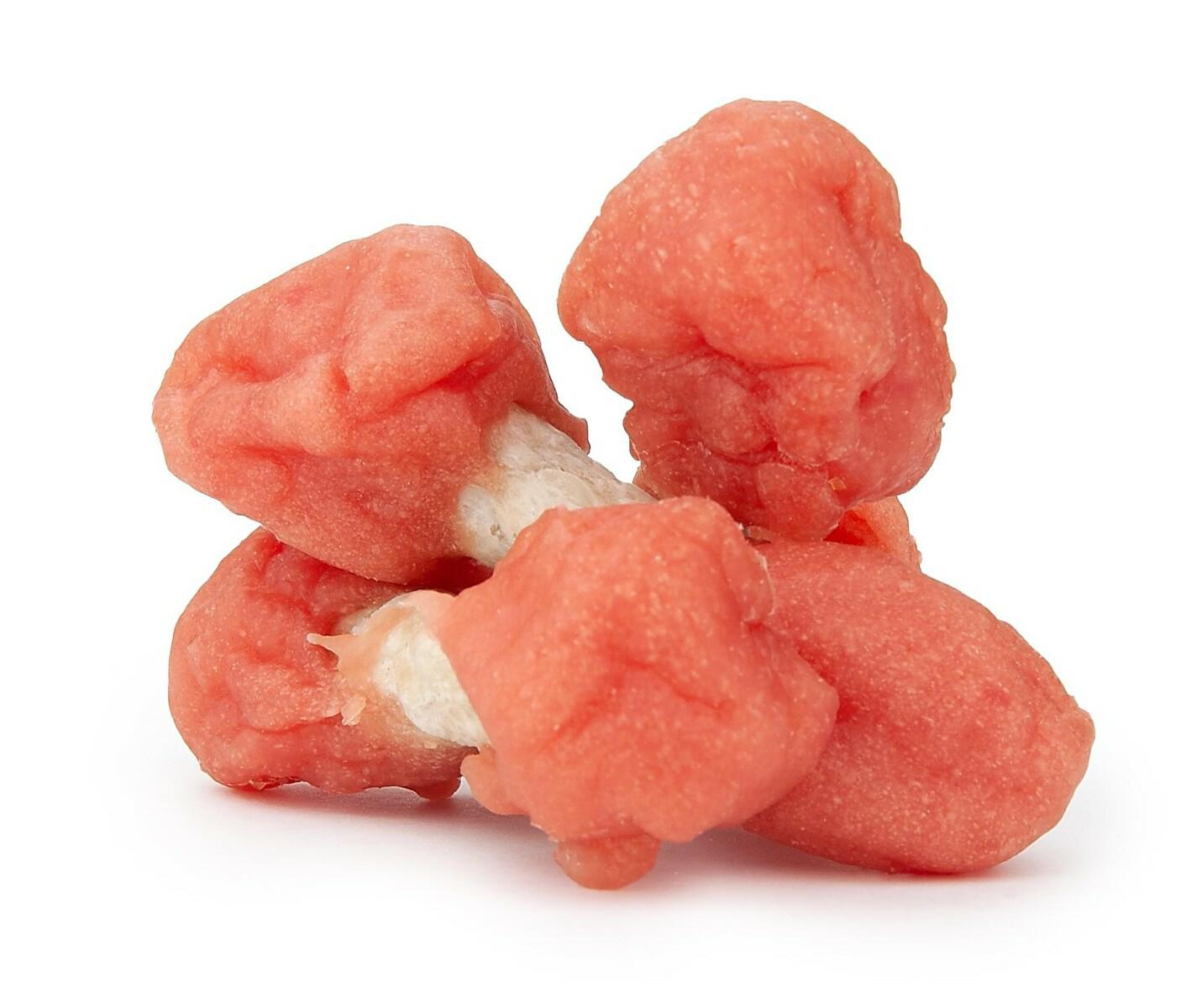 Skład: 45% skóra bydlęca, 40% mięso z kurczaka, 5% mączka pszenna (12% białka, 14% wilgotność, 72% skrobia, 2% popiół), 5% skrobia, 3% sorbitol, 2% gliceryna
