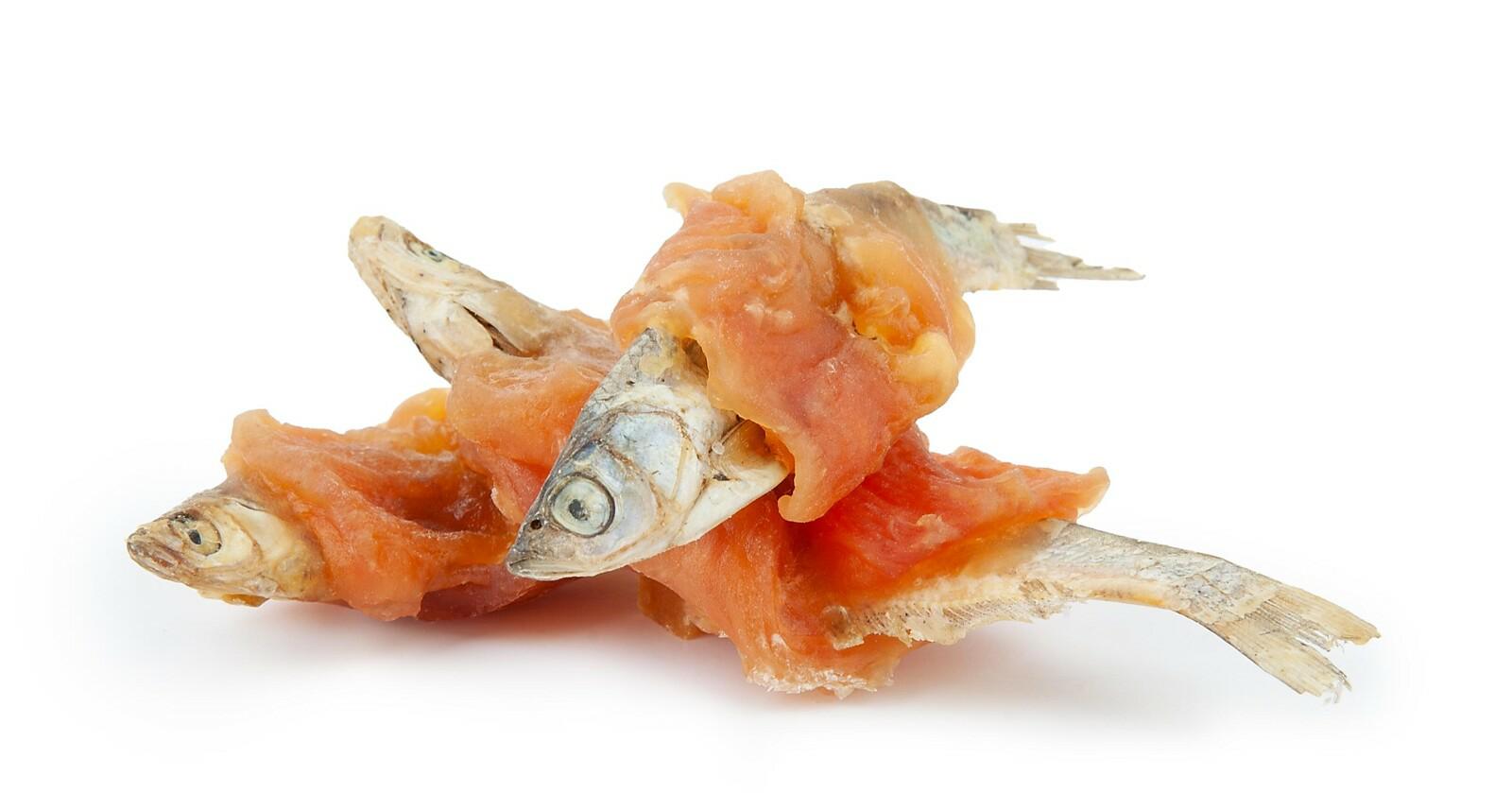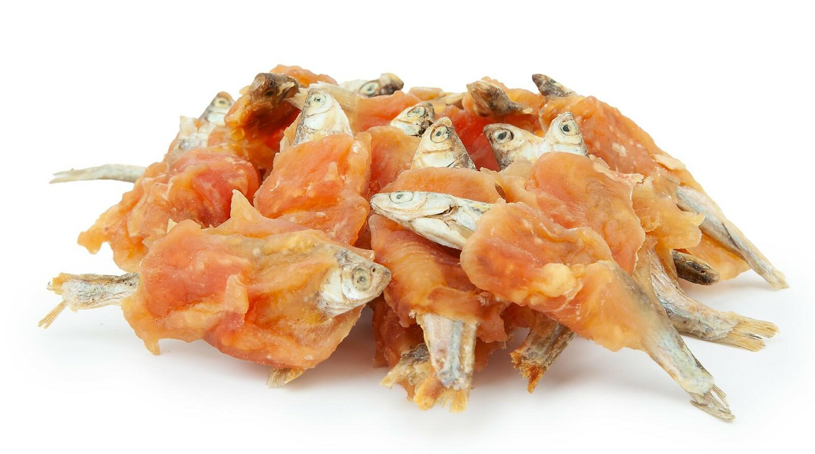 Suszona sardynka została owinięta w aromatyczne paski z piersi kurczaka. Wspaniała przekąska wykonana w 100% z naturalnego mięsa.