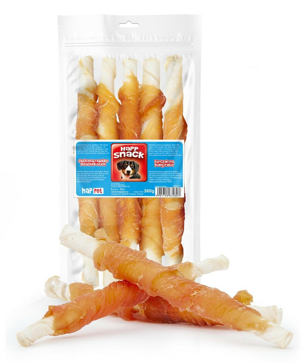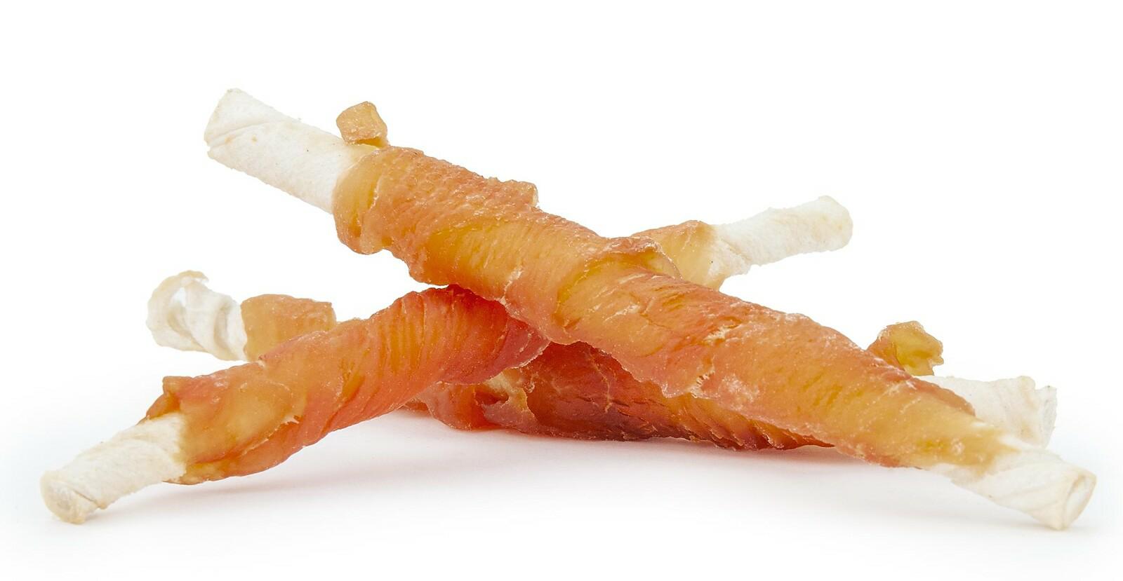 Duże, białe pałki z prasowanej skóry wołowej owinięte mięsem z piersi kurczaka.