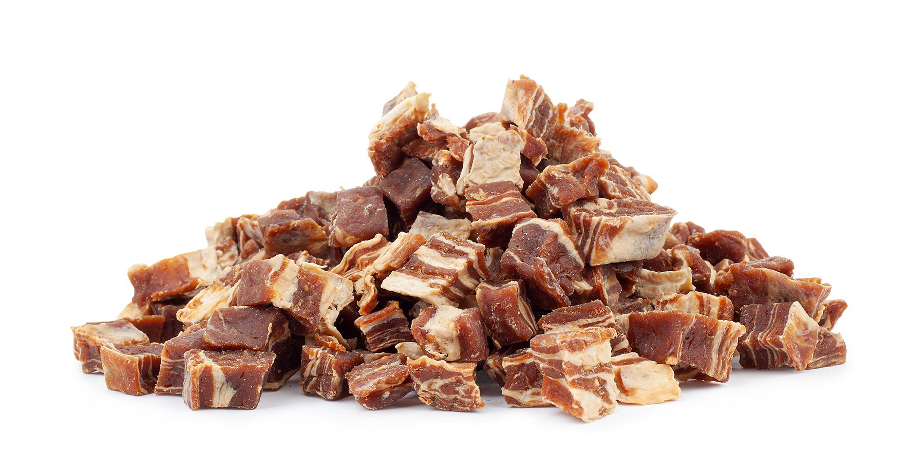 Wyśmienite urozmaicenie diety psów, kotów oraz innych ssaków mięsożernych (fretek, jeży pigmejskich, skunksów, lisów rudych). Mięso kurczaka obfituje w dobrze przyswajalne białko, witaminy z grupy B (B1, B2, B12) oraz potas, z kolei skóra wołowa dostarcza sporych ilości kolagenu. Niska zawartość tłuszczu czyni stek wołowy kostki, dobrym komponentem diety ubogotłuszczowej, stosowanej dla zwierząt otyłych i zmagających się z chorobami wątroby oraz trzustki. Dzięki suszeniu, produkt zachowuje długo zdatność do spożycia, bez dodatku sztucznych konserwantów.