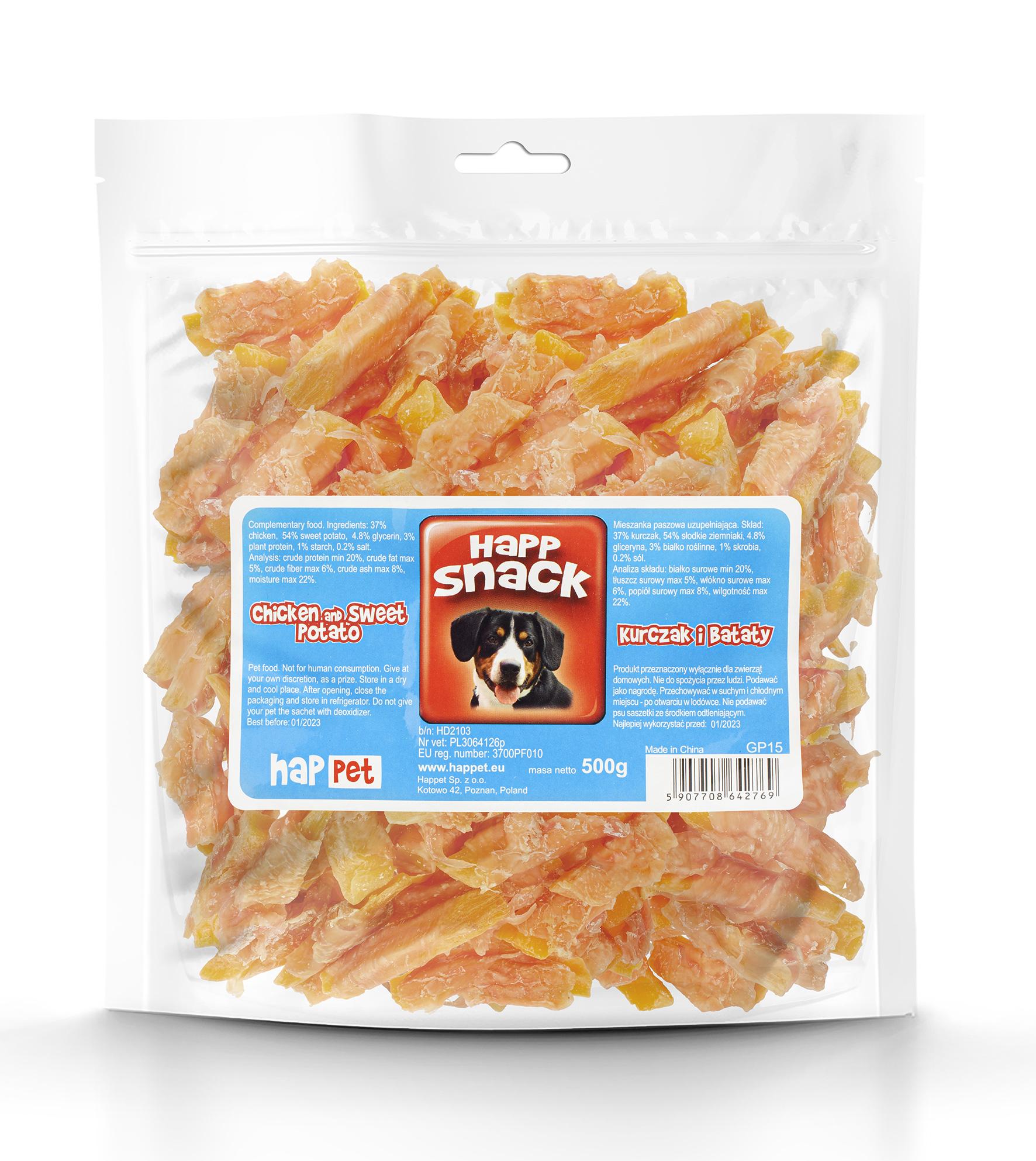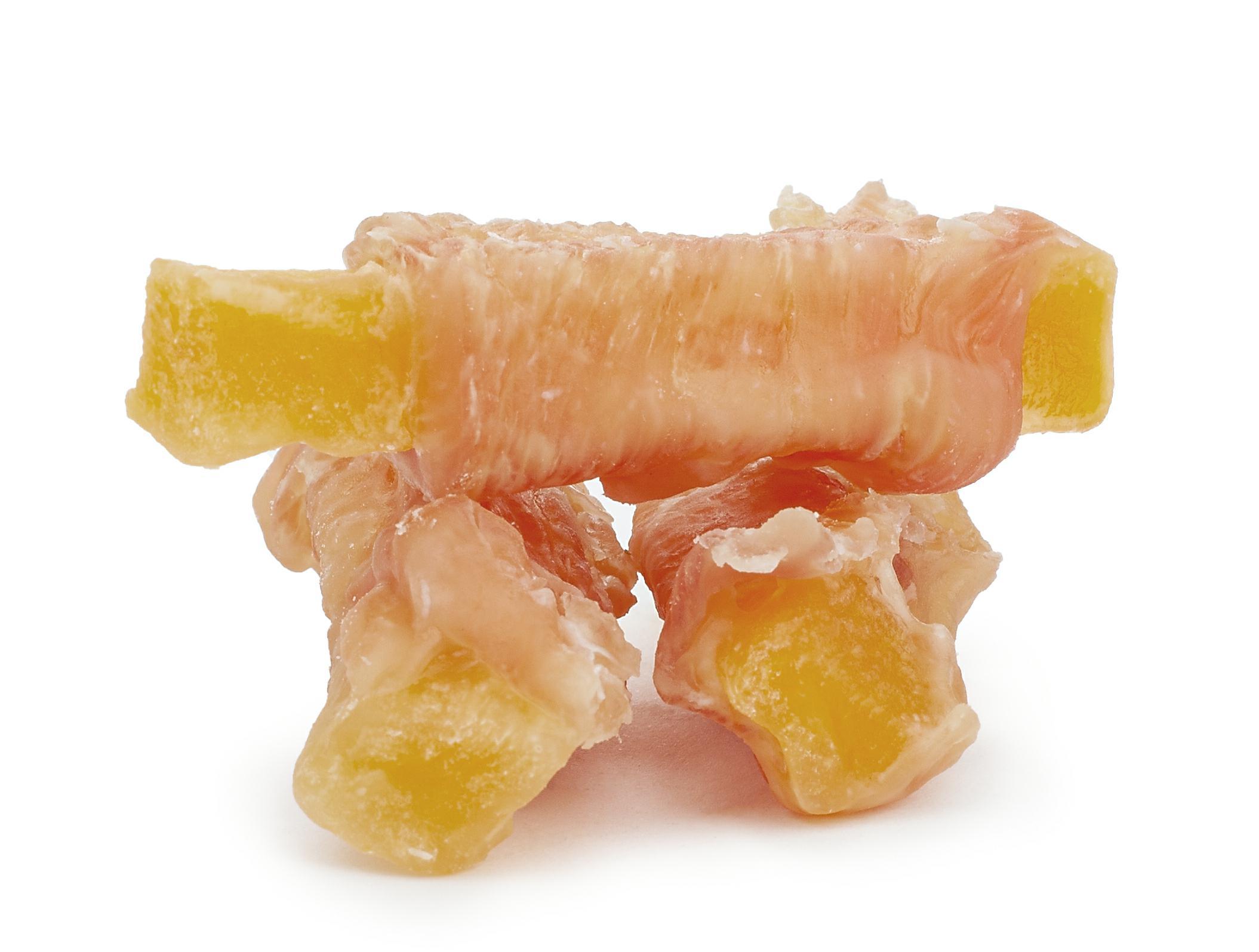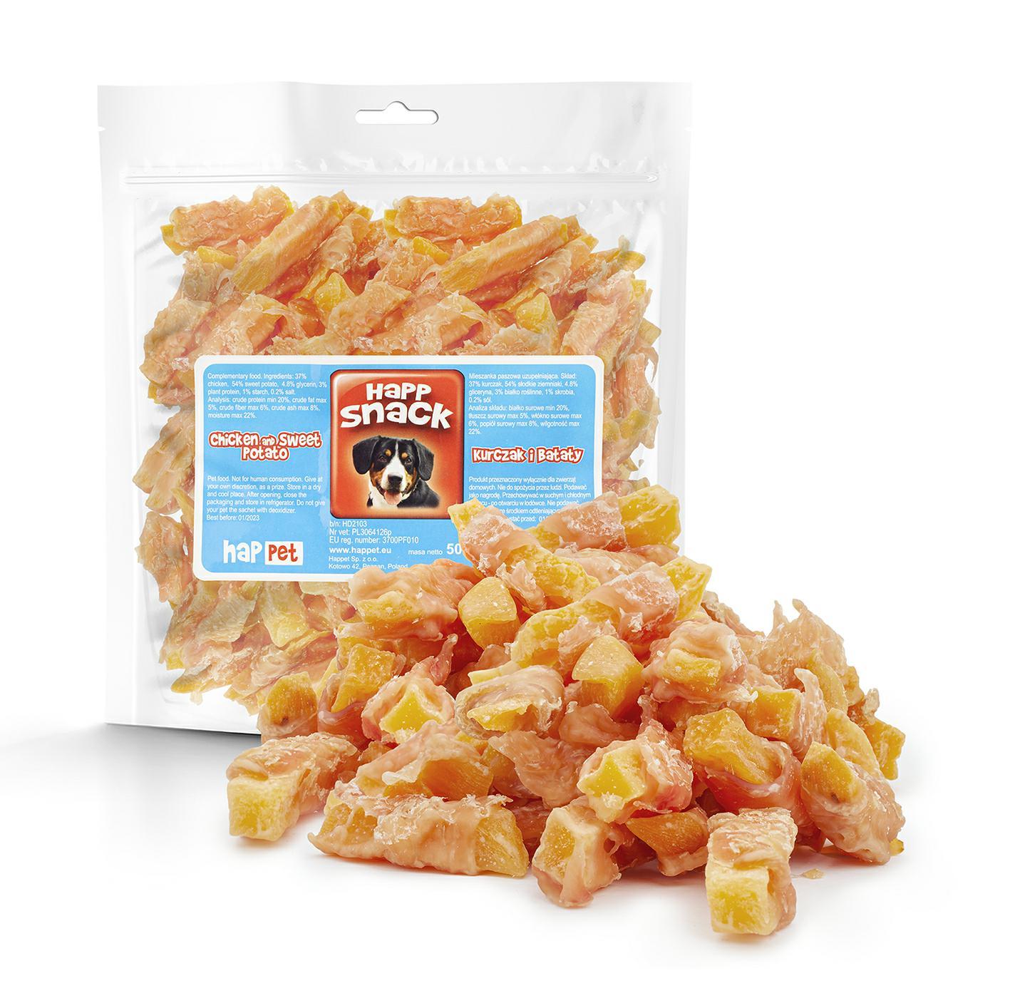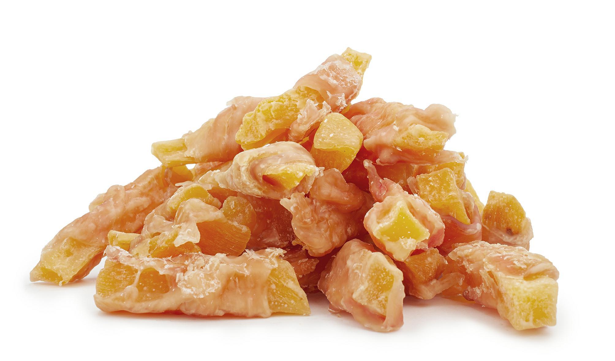 Zbilansowana przekąska dla psów. Kombinacja delikatnego mięsa drobiowego oraz słodkich ziemniaków, zadowoli każde, nawet najbardziej wybredne psie podniebienie. Mięso z kurczaka dostarcza łatwo przyswajalnego białka o wysokiej wartości biologicznej, cennego zwłaszcza w okresie wzrostu i rekonwalescencji. Bataty stanowią źródło błonnika pokarmowego, potasu oraz witaminy A. W przeciwieństwie do zbóż i soi, słodkie ziemniaki nie uczulają, dzięki czemu przysmakiem możemy nagrodzić także psa-alergika. Obfitując w naturalne przeciwutleniacze, zmniejszają ryzyko nowotworów oraz opóźniają proces starzenia się. Produkt jest wolny od konserwantów, sztucznych barwników oraz innych syntentetycznych modyfikatorów smaku i zapachu. Niska zawartość tłuszczu (<5%) czyni go idealnym dla psów na diecie ubogotłuszczowej.