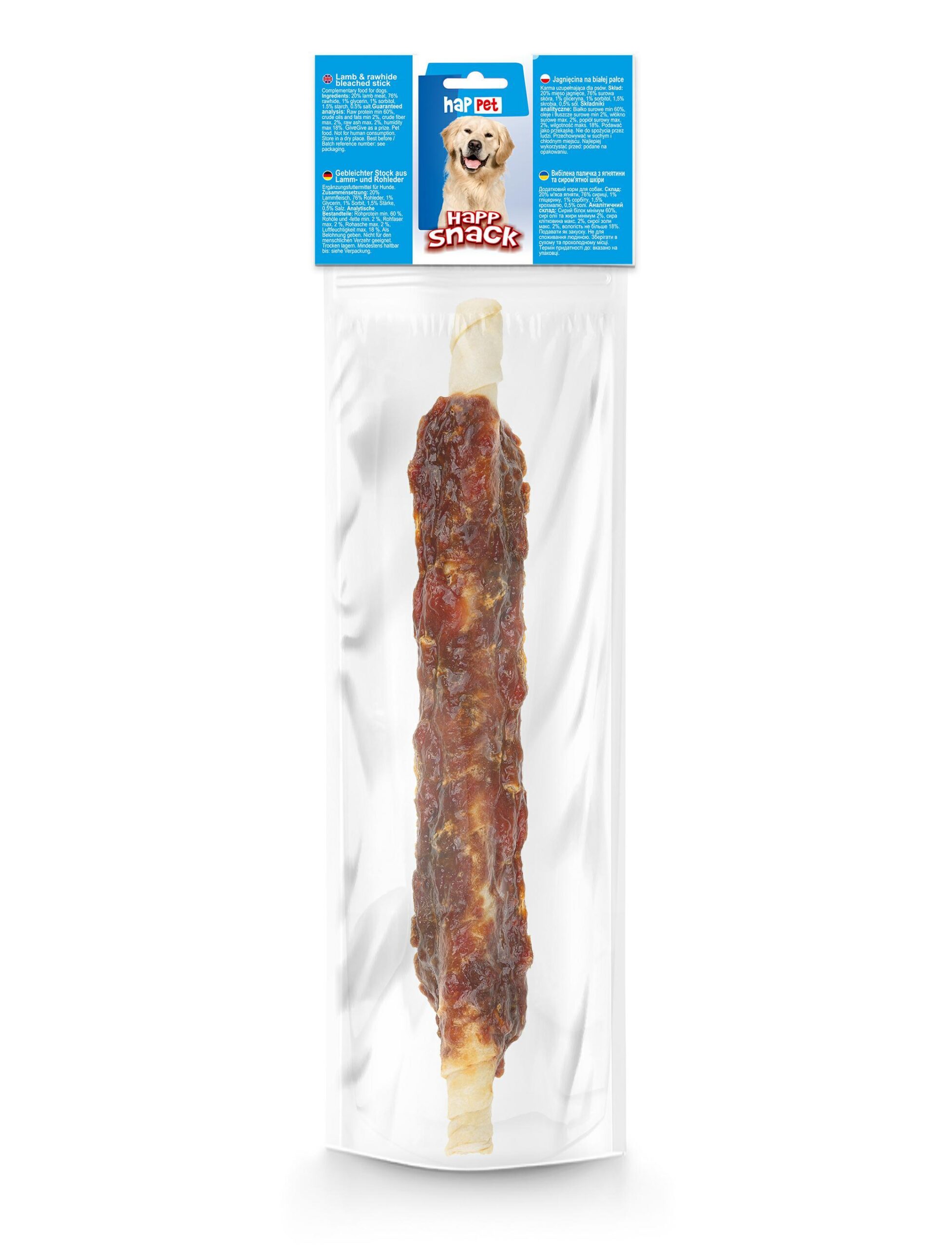 Duże, białe pałki z prasowanej skóry wołowej owinięte mięsem jagnięcym.