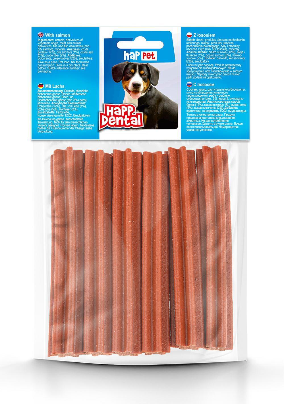 Do mięsnej receptury naszych dentali dodaliśmy łososia, który dodaje przysmakowi niepowtarzalnego smaku i wartości odżywczych. Łosoś znany jest już od lat jako bardzo zdorwa ryba, bogata w witaminy A, D oraz E, a także kwasy Omega-3. Te wartości korzystnie wpływają na zdrowie zarówno ludzi jak i zwierząt. Zapewnij swojemu pupilowi to, co najlepsze i wypróbuj dentale z łososiem z serii Happ Dental.