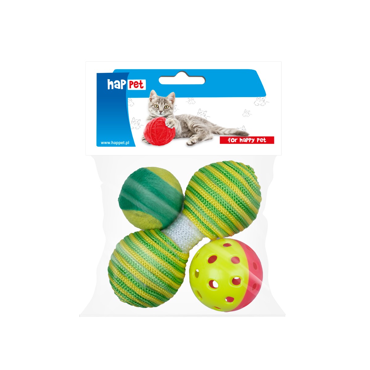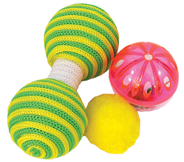 Fantastyczny, wielokolorowy zestaw składający się z trzech wielofunkcyjnych zabawek. Kot może z ich pomocą bawić się w polowanie, podrzucanie, drapanie i podgryzanie, rozbudzając przy tym prawdziwego tygrysa. Hantelek owinięty jest bezpiecznym, wytrzymałym sznurkiem. Jedną z piłeczek pokrywa miękki, przyjemny dla kocich łapek materiał, a druga składa się z przezroczystej, plastikowej obudowy wewnątrz której znajduje się intrygujący kociego pupila dzwonek. Warto pamiętać o regularnym kontrolowaniu stanu zabawek. Jeśli stwierdzimy, że przedmiot jest uszkodzony, zaleca się jego wymianę.