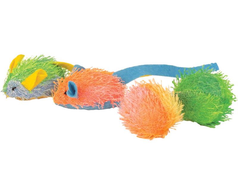 Zestaw kolorowych zabawek, które z pewnością przypadną do gustu każdego kota i wzbudzą w nim chęć do radosnych figli. Zabawki wykonane są z miękkiego materiału odpornego na kocie pazurki i ząbki. Kot może bawić się myszką na wiele sposobów – dla kociąt idealnie sprawdzi się jako przytulanka, z kolei osobniki dorosłe chętnie urządzą sobie polowanie.