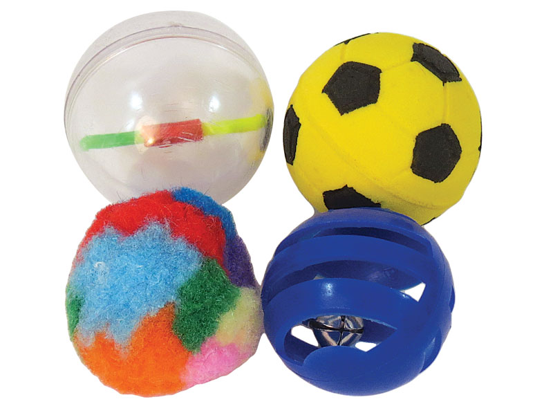 Zestaw czterech piłeczek wykonanych z różnych materiałów. Wzbudzają łowieckie instynkty i stymulują kota do aktywności ruchowej. Kulka pluszowa sprawdza się jako przytulanka i przypomina kotu naturalną sierść. Dwie, kolorowe piłeczki wykonane z plastiku przyciągają uwagę zwierzaka i zaciekawiają go na wiele godzin. Piłka z miękkiej gąbki skacze na wszystkie strony dając kotu jeszcze więcej zabawy. Wszystkie zabawki wchodzące w skład zestawu są całkowicie bezpieczne dla zwierząt i odporne na drapanie oraz gryzienie.