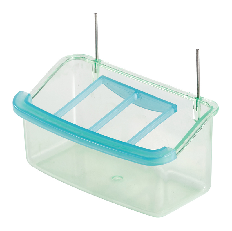 Karmidło plastikowe z nakładką, zawieszane na szczebelki klatki za pomocą metalowych haczyków.