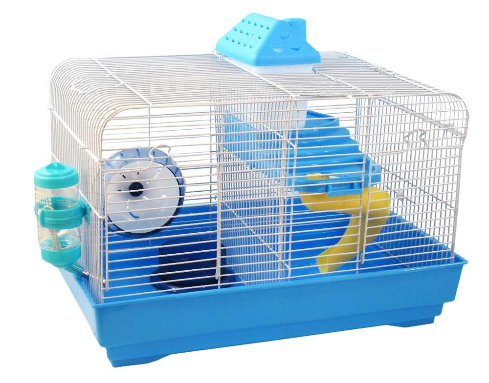 Klasyczna klatka druciana dla chomika, wyposażona dodatkowo w kołowrotek, tunel, domek, półkę i poidełko. Prosty kształt i kompaktowe wymiary sprawiają, że będzia pasowała do każdego wnętrza. Klatka podzielona na dwie osobne części z drzwiczkami z boku, dzięki czemu pozwala na trzymanie niezależnie dwóch zwierzątek w jednej klatce.