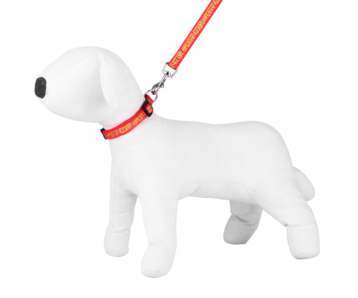 Komplet obejmuje smycz i obrożę. Wykonany jest z mocnej taśmy nylonowej z naszytą ozdobną taśmą.