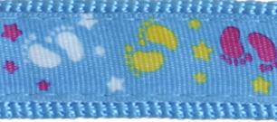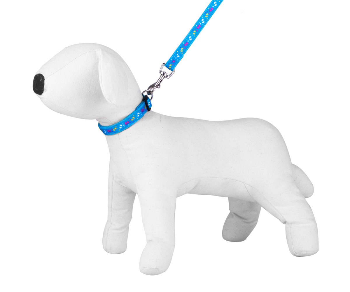 Komplet obejmuje smycz i obrożę. Wykonany jest z mocnej taśmy nylonowej z naszytą ozdobną tasiemką.