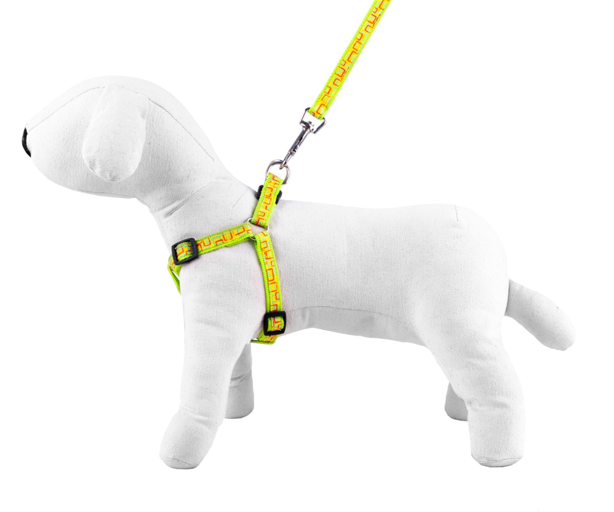 Komplet obejmuje smycz i szelki. Wykonany jest z mocnej taśmy nylonowej z naszytą ozdobną taśmą.