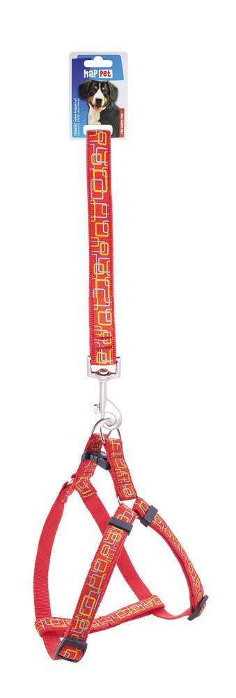 Komplet obejmuje smycz i szelki. Wykonany jest z mocnej taśmy nylonowej z naszytą ozdobną taśmą.