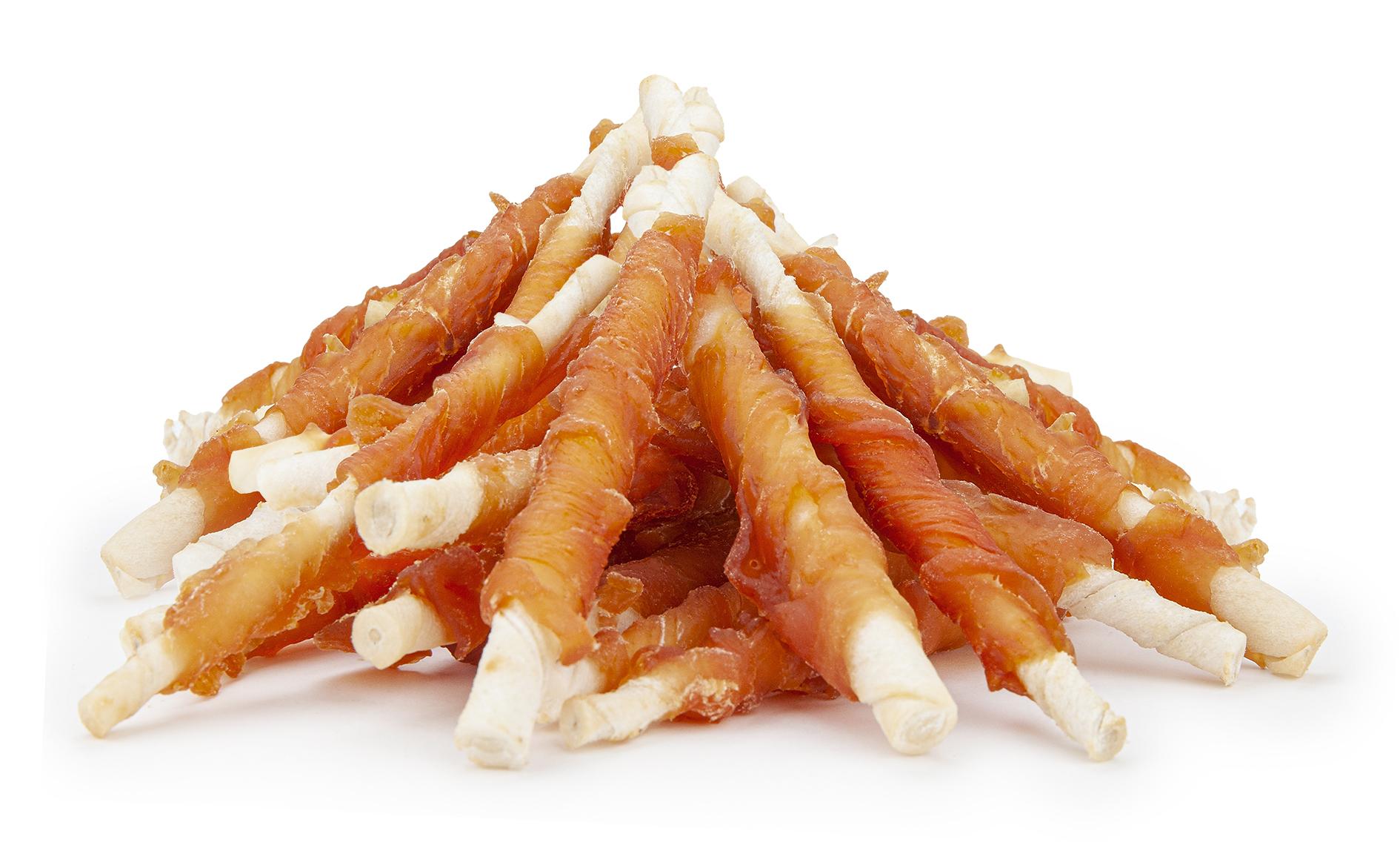 Aromatyczne paski z piersi kurczaka owinięte na pałeczki, wykonane z prasowanej skóry bydlęcej. Produkt stanowi idealne uzupełnienie psiej diety. Sprawdzi się również jako nagroda podczas treningu, czy spaceru. Naturalny, mięsny aromat to wynik użycia wysokiej jakości naturalnych składników. Przy produkcji nie zostały wykorzystane żadne sztuczne substancje konserwujące. Pies ogryzając pałeczkę zaspokaja swoją naturalną potrzebę żucia, przy okazji czynność ta przyczynia się do poprawy zdrowia psiego uzębienia. Podczas jedzenia suszonych kąsków i skór prasowanych usuwany jest nalot i kamień nazębny, którego nieczyszczenie prowadzi do powstawania próchnicy i nieprzyjemnego zapachu z pyska.