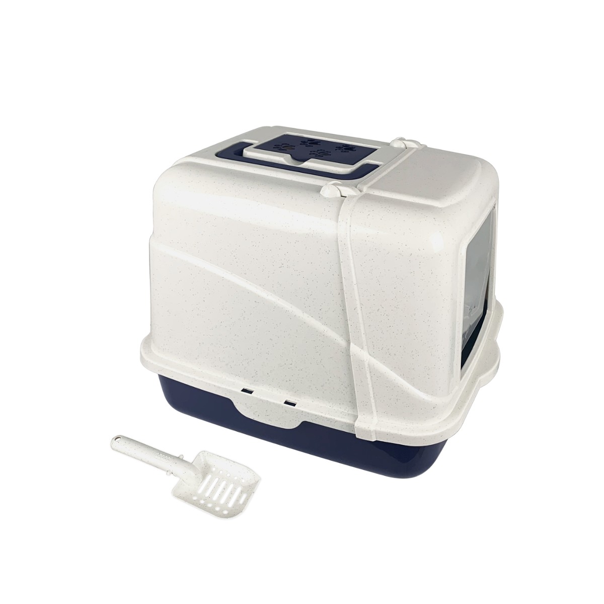 Dzięki uchwytowi górnemu można przenosić kuwetę. Wahadłowe drzwiczki umożliwiają kotu bezproblemowe wchodzenie i wychodzenie z kuwety.