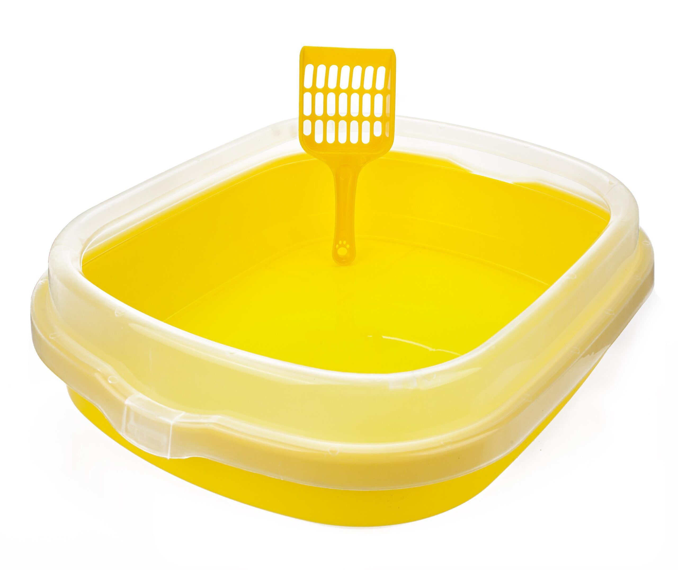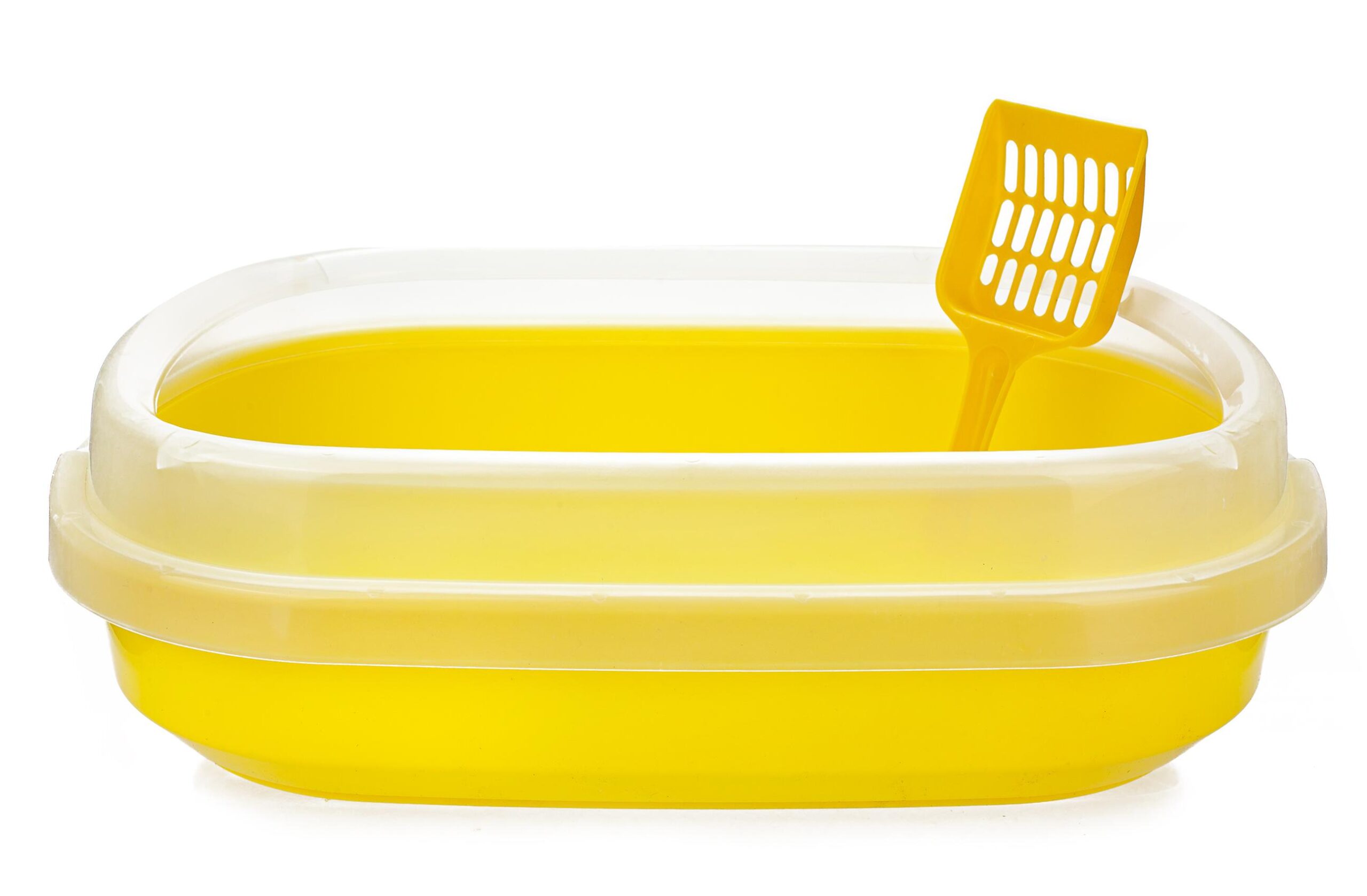 Kuweta z wysoką ramką zapobiegającą rozsypywaniu żwirku poza kuwetę.