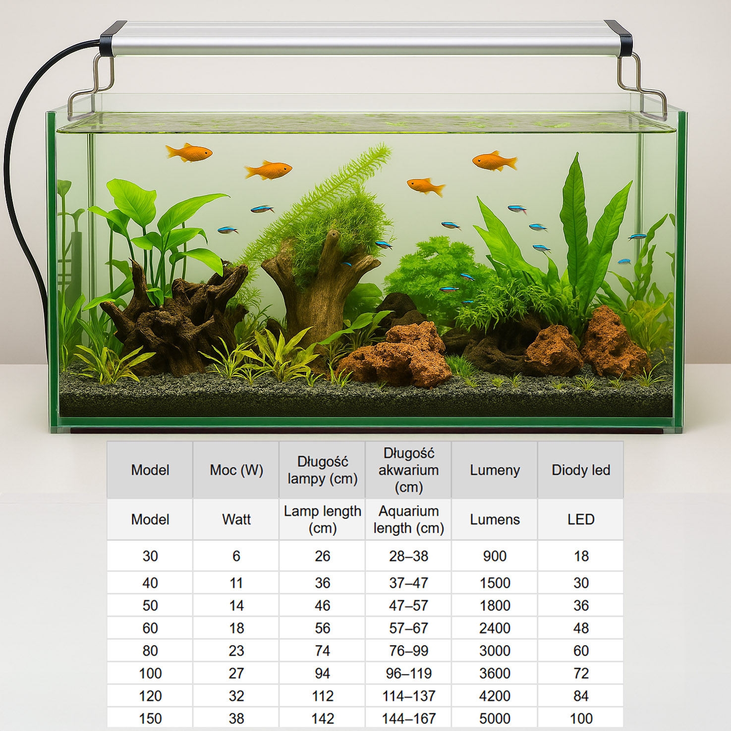 Lampy przeznaczone są do oświetlania słodkowodnych akwariów dekoracyjnych i roślinnych.Dzięki wykorzystaniu odpowiednio dobranych, wydajnych diod LED, lampa jest bardzo ekonomicznym źródłem światła zapewniającym do 60% oszczędności w porównaniu do świetlówek.Zastosowane diody 5730 o temperaturze barwowej 8000K zapewniają bardzo skuteczną fotosyntezę roślin, a optycznie jasne światło podkreśla naturalne kolory ryb.