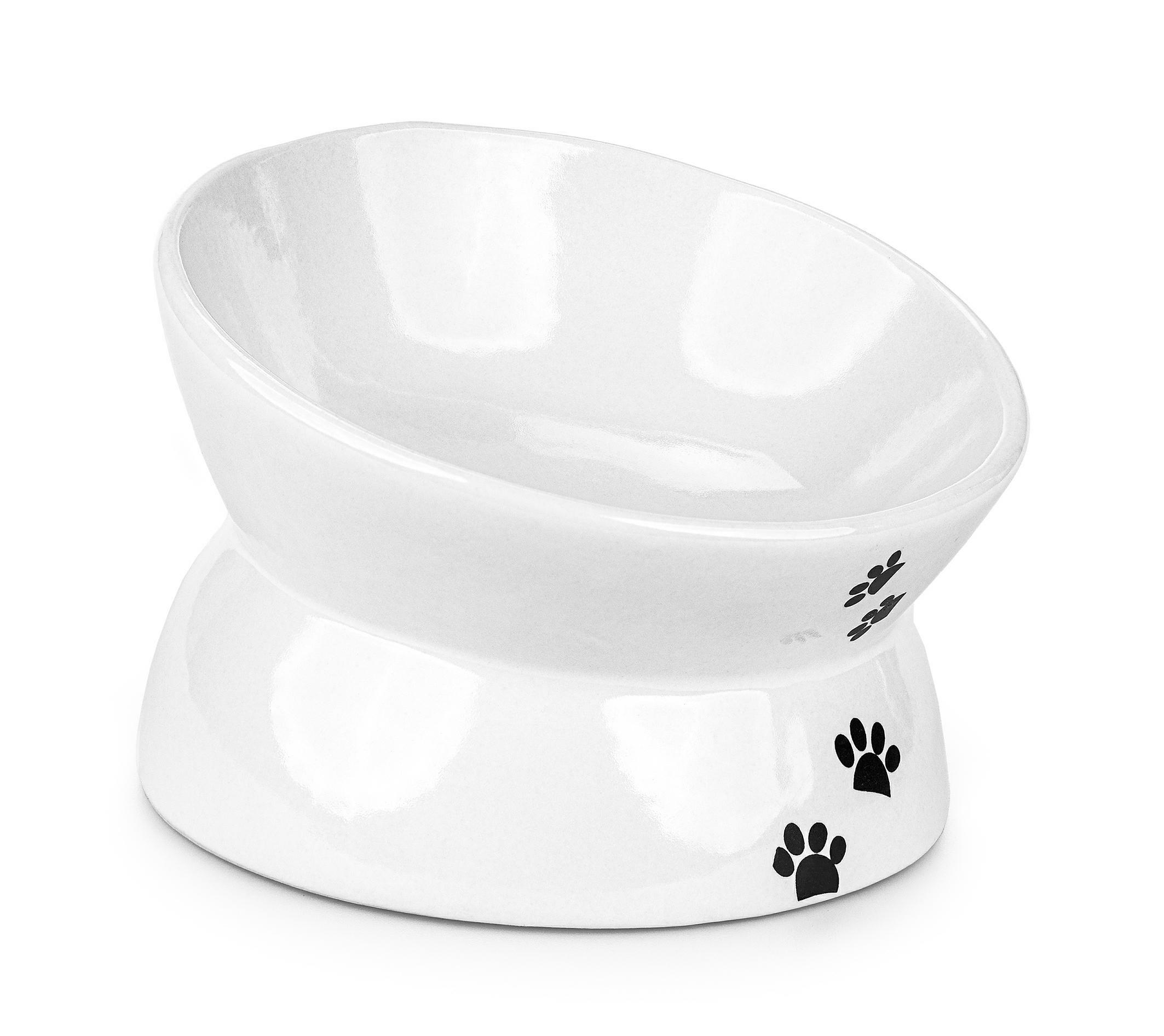 Właściwa miska dla kota to ważna kwestia! Miska ceramiczna podwyższona jest stabilna i estetycznie zaprojektowana. Biały kolor i niewielkie symbole kocich łapek sprawiają, że jest prosta, a jednocześnie efektowna. Miska jest odpowiednia do podawania różnych rodzajów karmy oraz wody. Podwyższenie miseczki ogranicza ryzyko rozsypywania się jedzenia i wylewania wody.