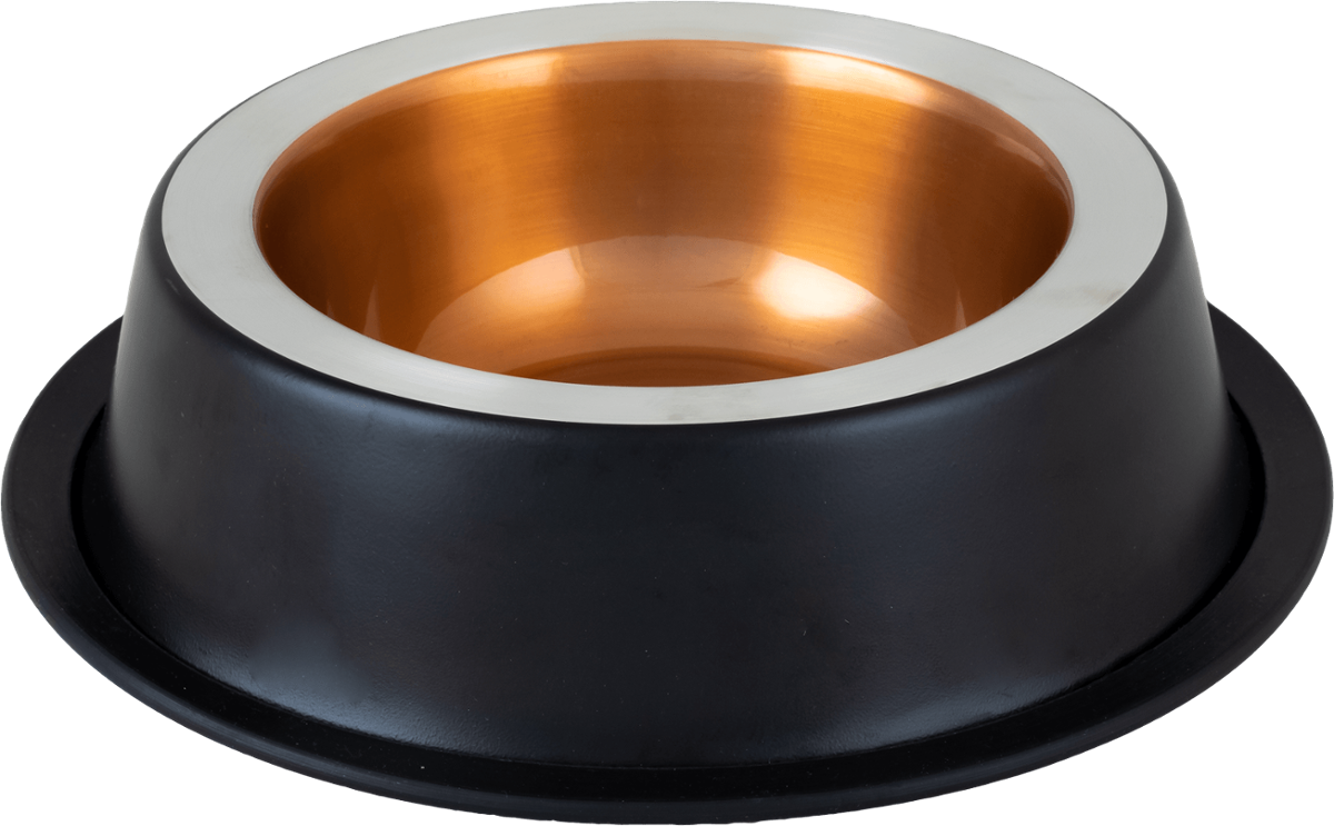 Metalowa miska z błyszczącym środkiem w kolorze miedzi, oraz matowym, czarnym wykończeniu na zewnątrz.