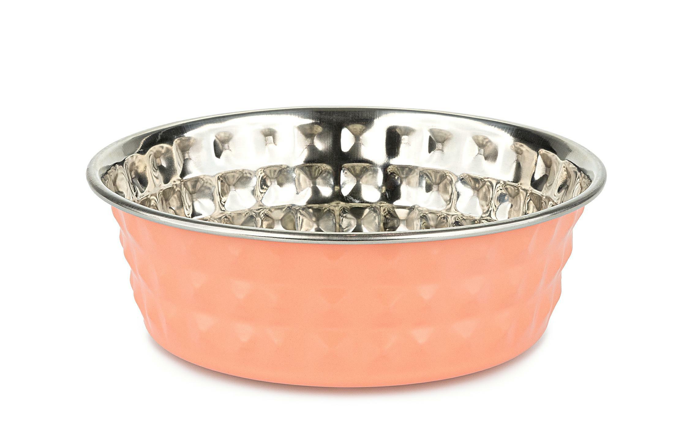 Miska w diamentowy wzór łączy klasyczny design z nowoczesnym wzorem, zachowując przy tym właściwości standardowej miski, do której przywykł Twój pupil. Dodatkowo posiada antypoślizgowe gumki zamocowane na spodzie, które sprawią, że pozostanie stabilna bez względu na zapał i radość z jaką zwierzak podejdzie do jedzenia. Została wykonana ze stali nierdzewnej, co sprawia że jest bezpieczna dla zwierząt, odporna na uszkodzenia i łatwa w czyszczeniu. Miska jest odpowiednia do podawania karmy suchej, karmy mokrej i wody.