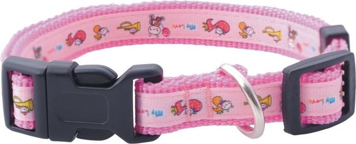 Obroża wykonana jest z mocnej taśmy nylonowej, z naszytą ozdobną tasiemką we wzorki.