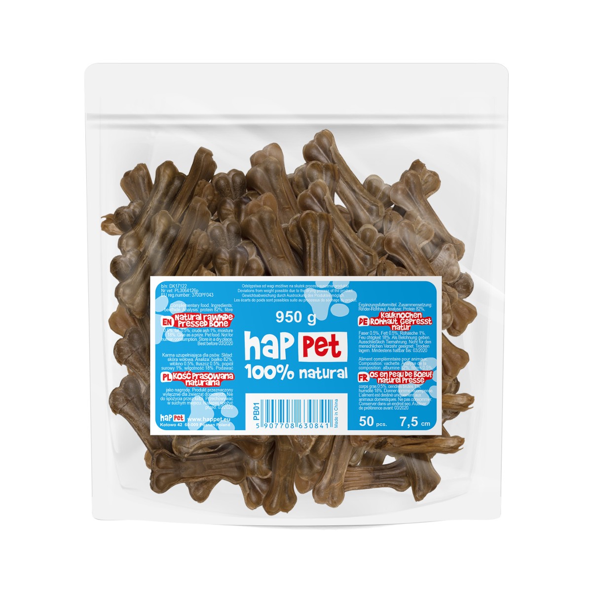 Kości firmy Happet produkowane są ze specjalnej masy przygotowywanej z rozgotowanej skóry wołowej, która następnie zostaje wysuszona i sprasowana na kształt prawdziwej kości.