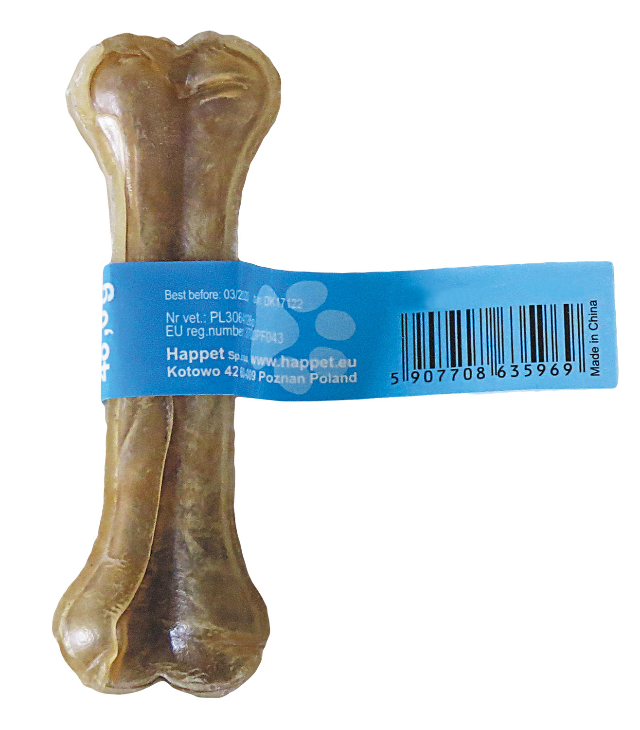 Kości firmy Happet produkowane są ze specjalnej masy przygotowywanej z rozgotowanej skóry wołowej, która następnie zostaje wysuszona i sprasowana na kształt prawdziwej kostki.