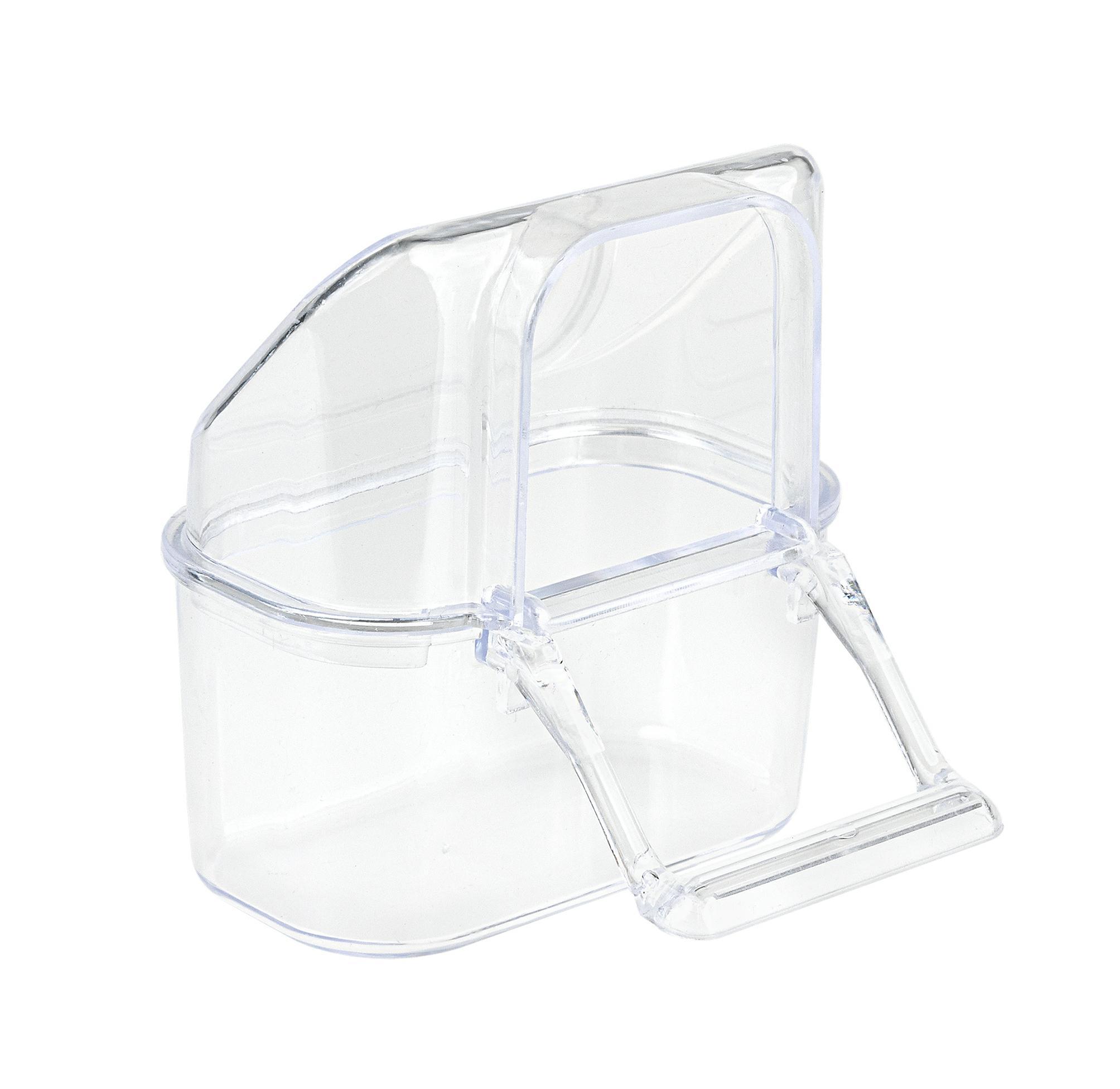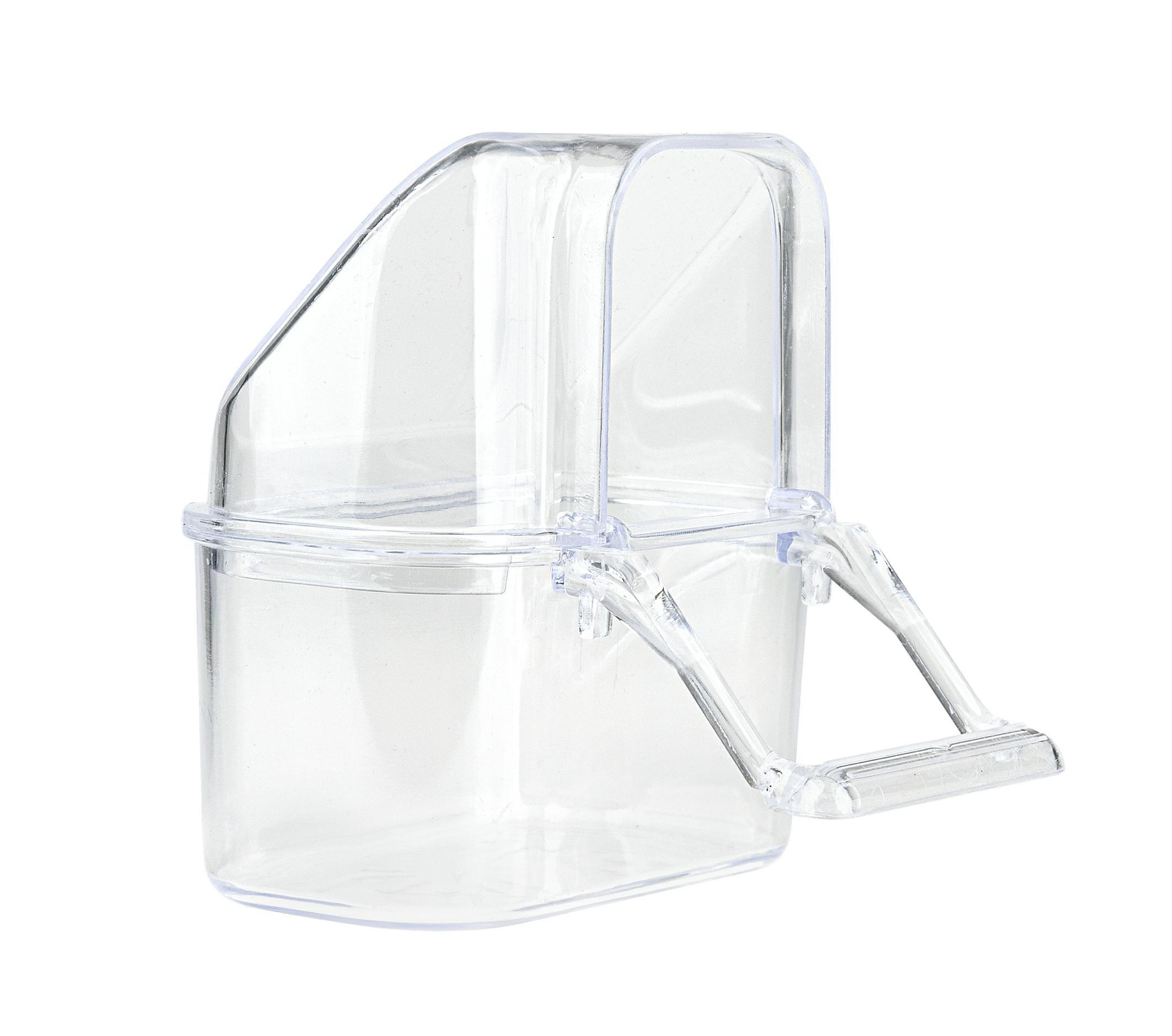 Zamknięte karmidło zewnętrzne z siedziskiem, mocowane na szczebelki klatki.