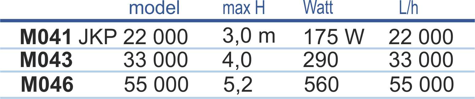 Niskociśnieniowa pompa rurowa – duża wydajność przy niskim zużyciu prądu. Pompuje duże ilości wody na niewielkie wysokości, polecane np. do niewysokich kaskad, systemów filtracyjnych, gejzerów, basenów ogrodowych, stawów koi, oczek wodnych, fontann i systemów filtrujących.