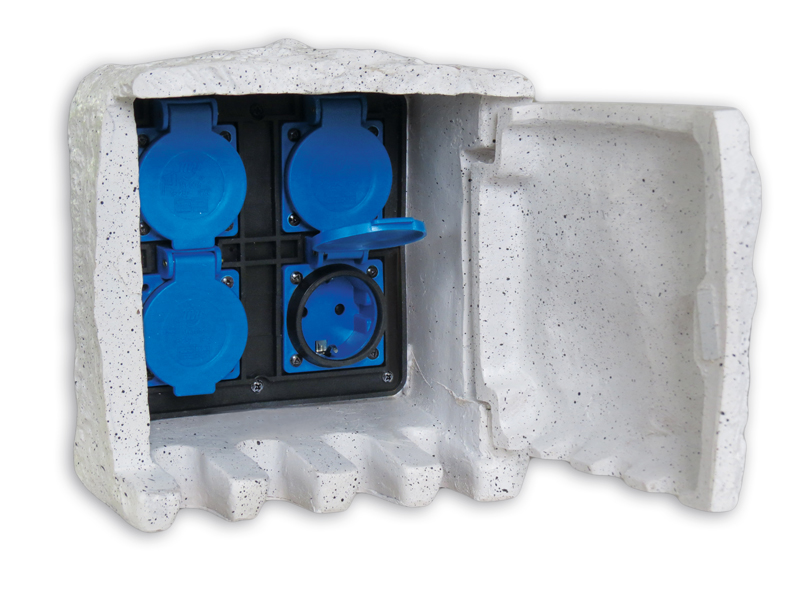 Ozdobny przedłużacz / rozdzielacz ogrodowy w obudowie imitującej naturalny kamień. Wyposażony w 4 hermetyczne gniazda.