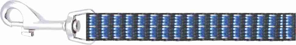Smycz wykonana jest z mocnej taśmy nylonowej z naszytą odblaskową taśmą. Wyposażona w mocne, metalowe zapięcie.