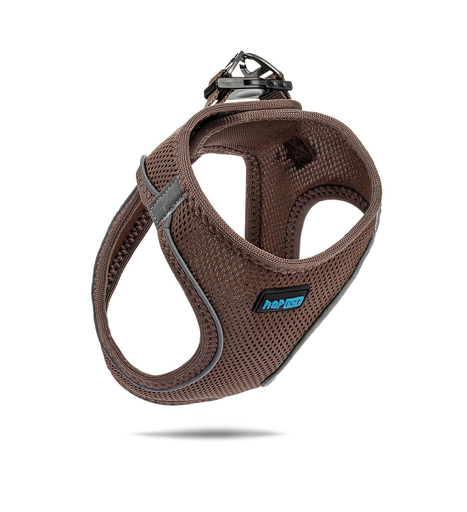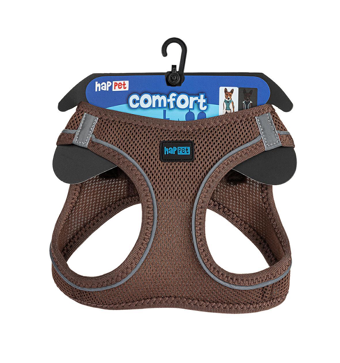 Szelki Air Comfort posiadają obręcz szyjną i piersiową z łączeniem na klatce piersiowej i plecach, zostały wykonane z solidnego, sztywnego materiału przepuszczającego powietrze, z odblaskowymi elementami. Zapinane są dwuetapowo, na plastikową klamrę oraz rzep.