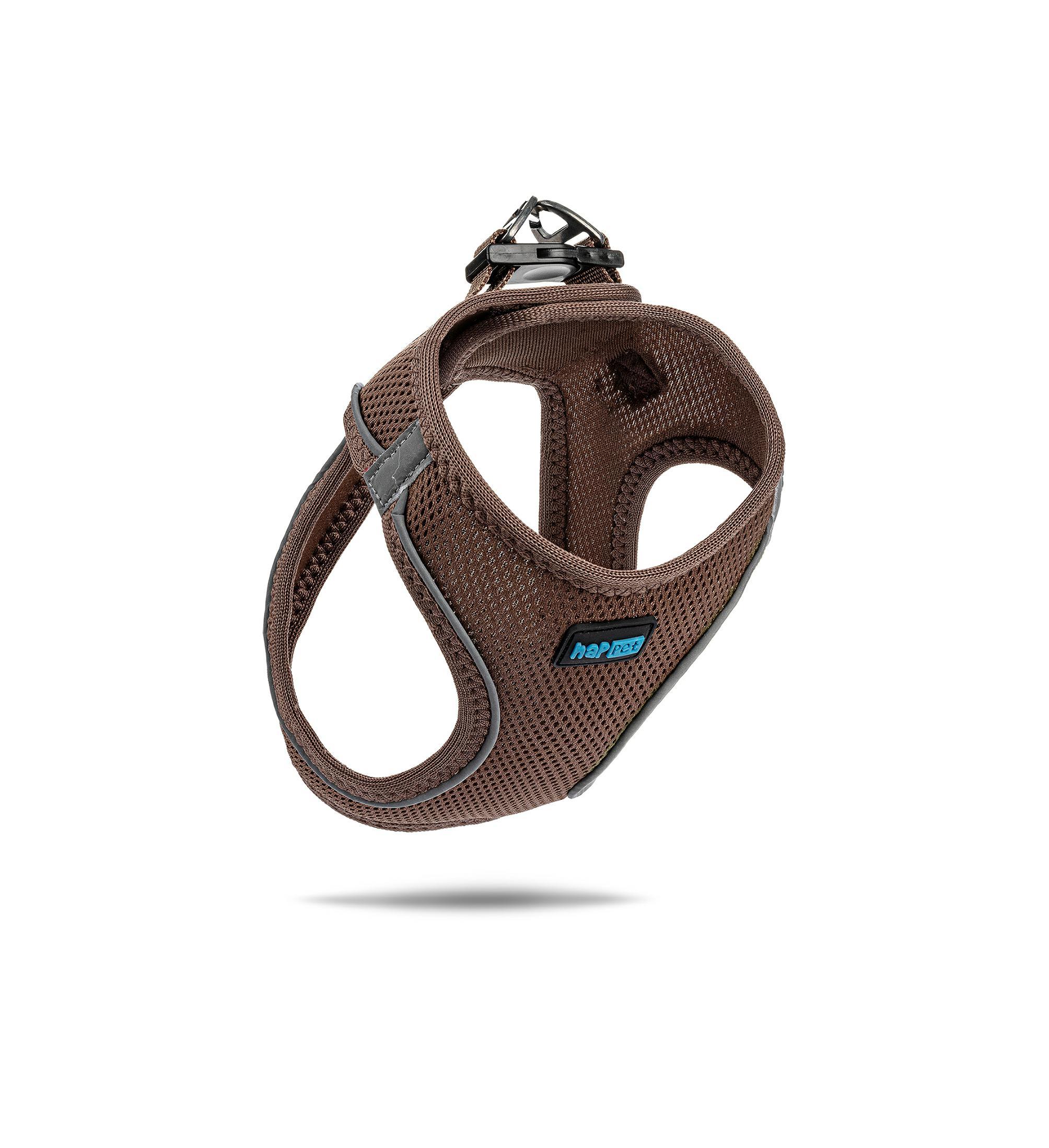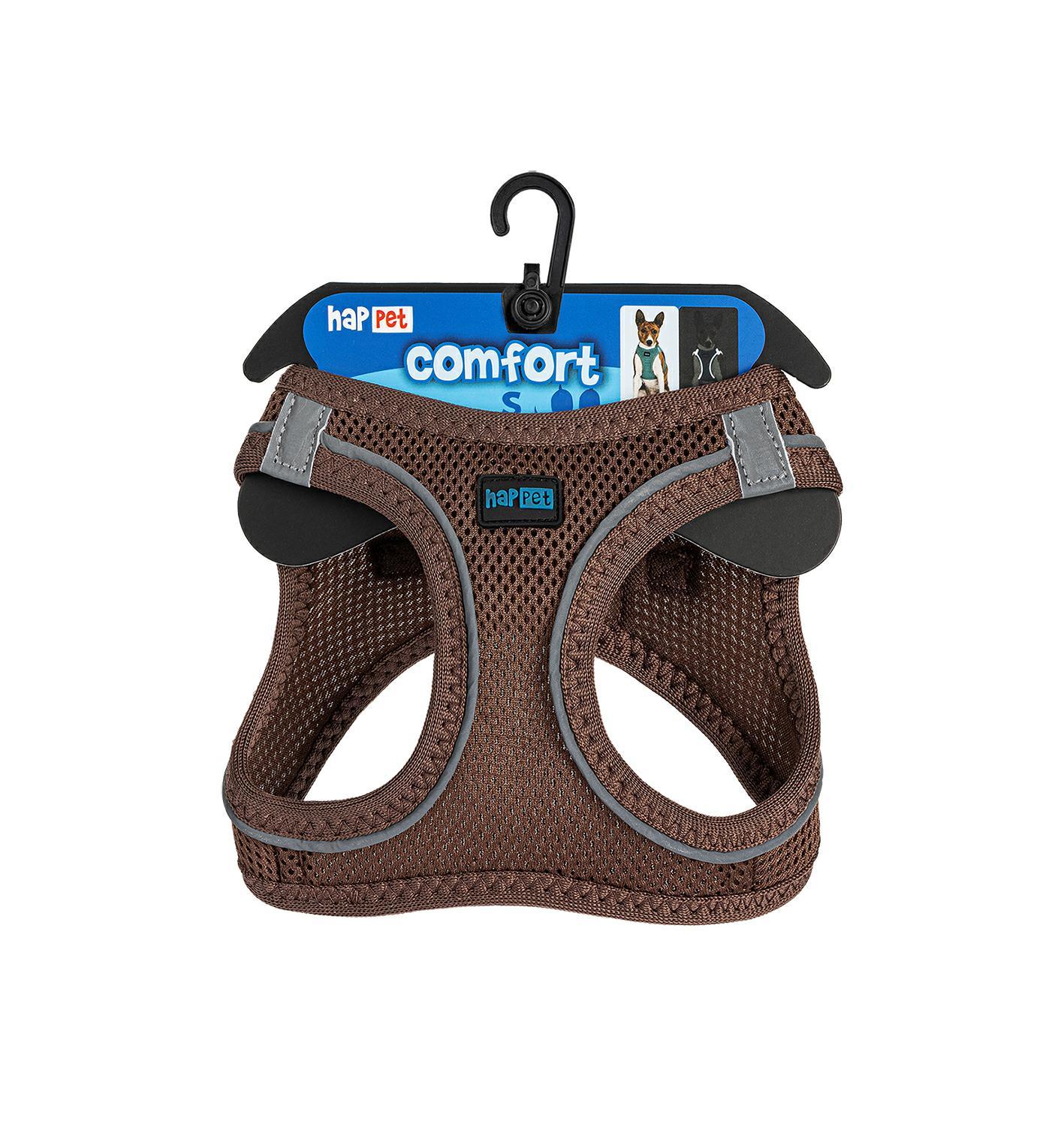 Szelki Air Comfort posiadają obręcz szyjną i piersiową z łączeniem na klatce piersiowej i plecach, zostały wykonane z solidnego, sztywnego materiału przepuszczającego powietrze, z odblaskowymi elementami. Zapinane są dwuetapowo, na plastikową klamrę oraz rzep.