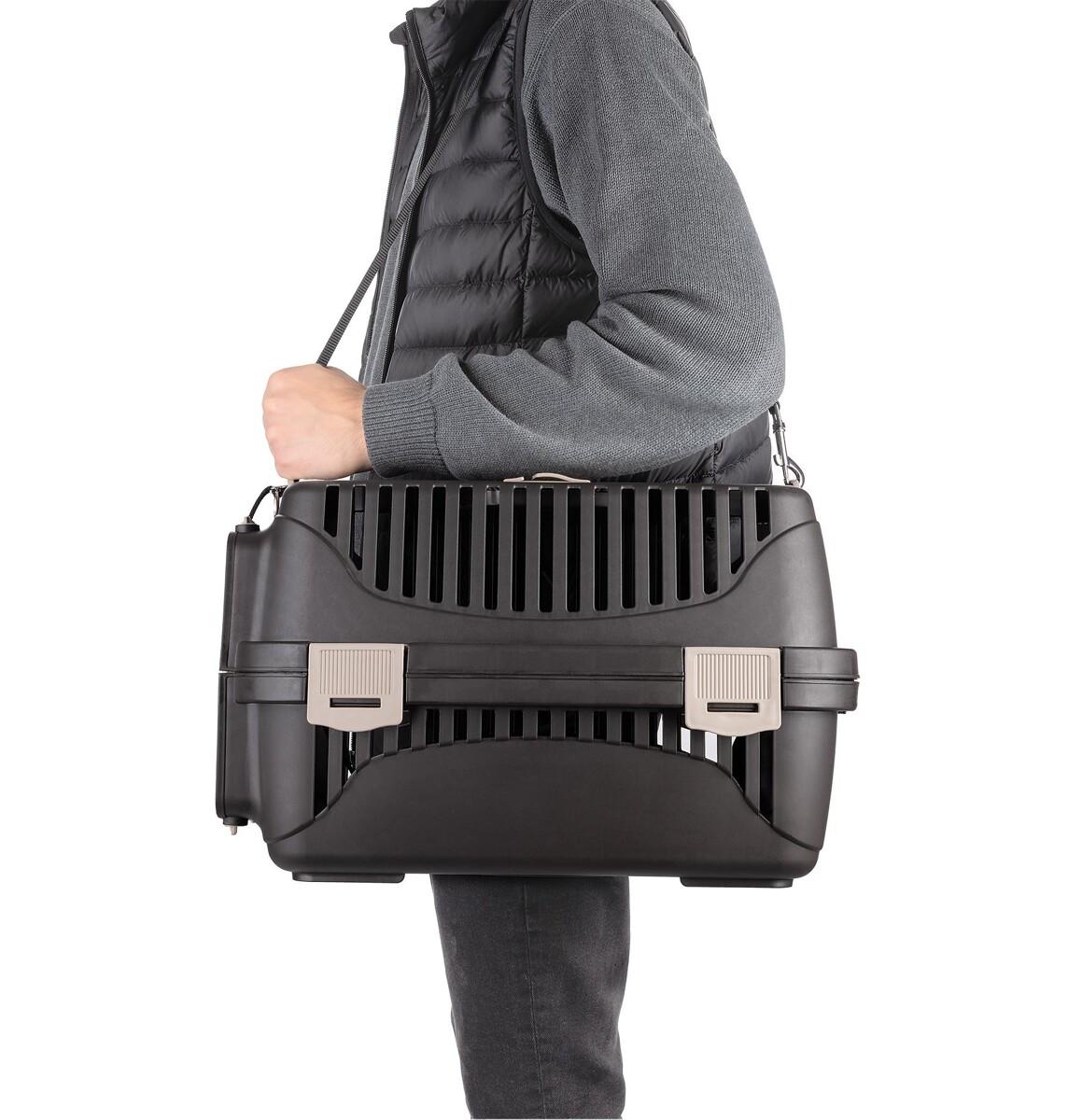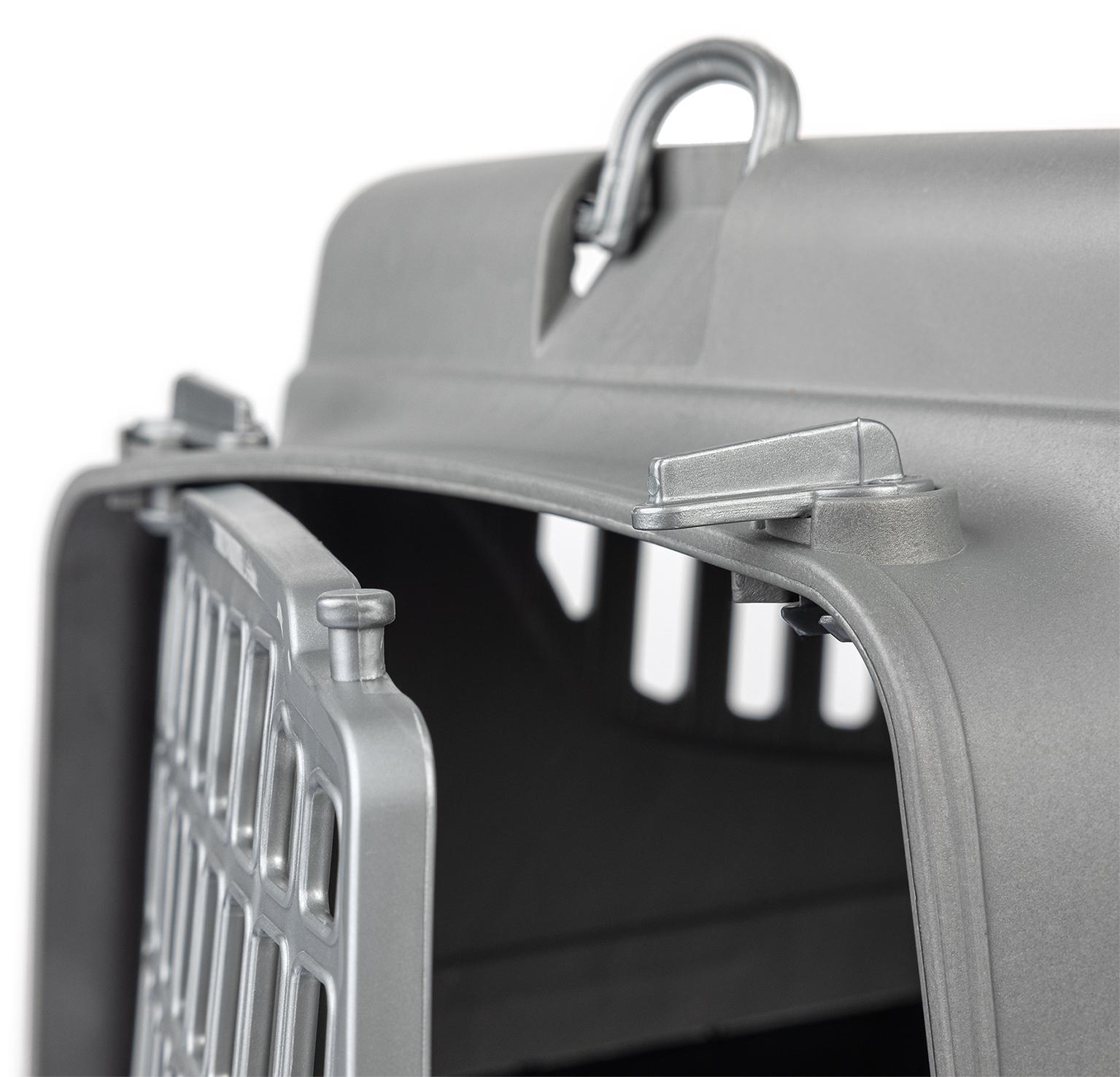Transporter jest wygodny również w otwieraniu i zamykaniu – przednia krata zdejmuje się całkowicie, łatwo ją z powrotem zamontować. W razie potrzeby w transporterze można odpiąć również całą górę, która jest przymocowana na proste klipsy.