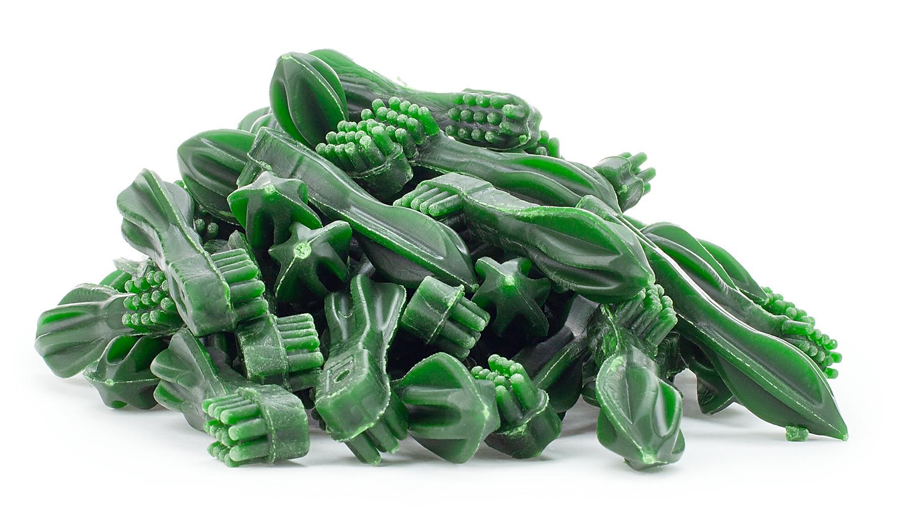 Skład: 45,5% mięso z piersi kurczaka, 34,985% skrobia kukurydziana, 11% skrobia ryżowa, 4% gliceryna, 4% sorbitol, 0,5% minerał, 0,01% barwnik spożywczy, 0,005% aromat miętowy