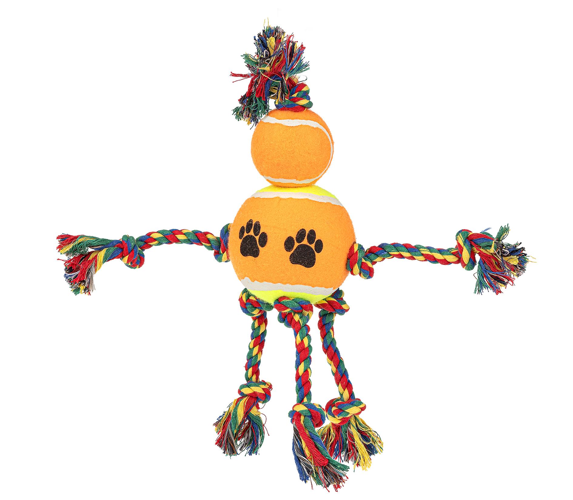 Wykonana z wytrzymałego kolorowego sznurka, połączonego z dwoma piłeczkami tworzacymi kształt ludzika. Solidny splot przetrwa nawet wielogodzinne gryzienie i szarpanie, co dodatkowo pomaga zachować higienę jamy ustnej pupila – podczas żucia sznurka włókna dostają się między zęby efektywnie je czyszcząc. Produkt świetnie sprawdza się podczas zabaw w aportowanie i przeciąganie, oraz umila czas czworonożnym pupilom w czasie oczekiwania na powrót właściciela. Zabawka przeznaczona jest dla dużych i średnich psów.