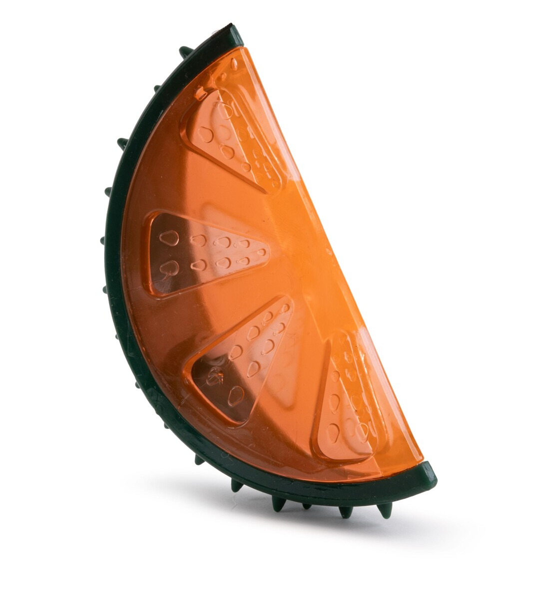 Zabawka została wykonana z wytrzymałej, elastycznej gumy, która jest odporna na intensywne gryzienie i jednocześnie bezpieczna dla zębów. Jej półokrągły kształt i teksturowane brzegi zachęcają do aktywności – idealna do żucia, aportowania i samodzielnej zabawy. Cytrusowy design pobudza ciekawość psa i sprawia, że zabawa staje się jeszcze bardziej angażująca.